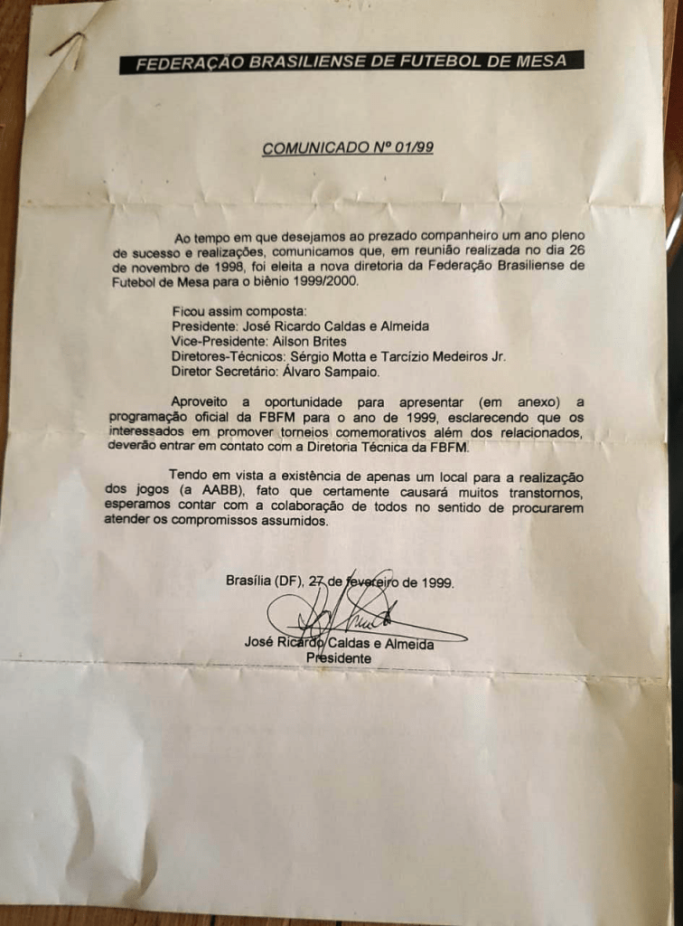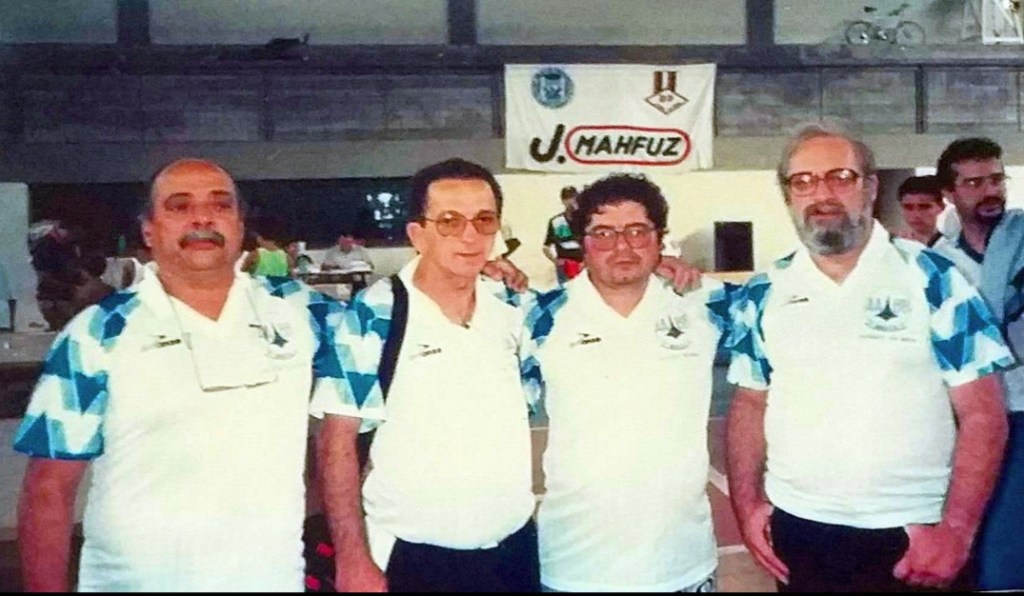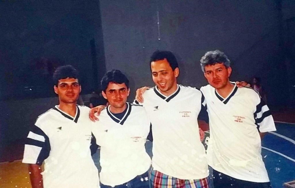 Formação da AABB, de Brasília (DF), no XIV Campeonato Brasileiro Interclubes de Futebol de Mesa – 3 Toques, realizado em Paty do Alferes (RJ), de 1 a 3 de abril de 1994: os saudosos Lourival Couto e Álvaro Sampaio, Jan Buarque e Sérgio Motta.