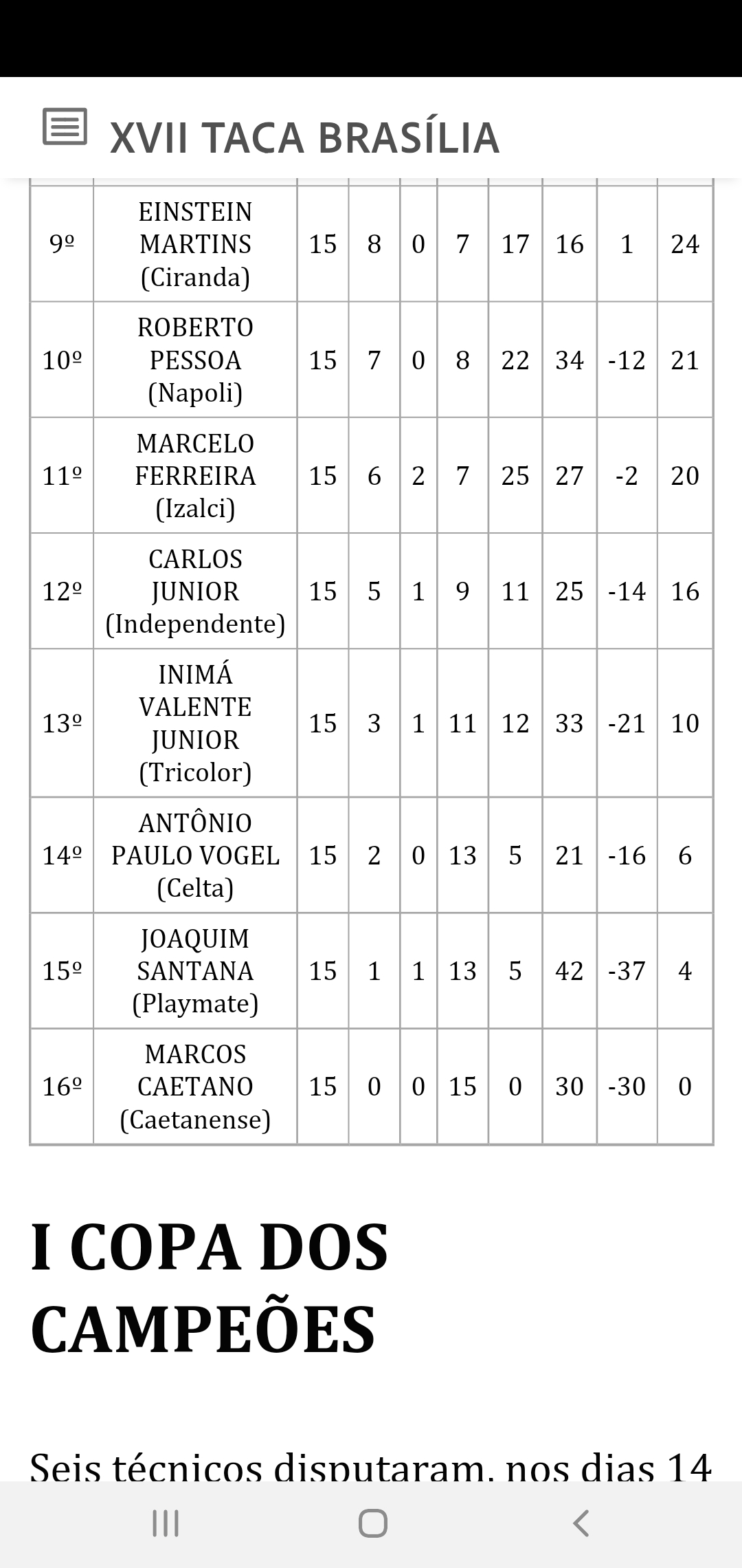Após jogos emocionantes, a classificação final apontou Fernando Gomes, representando a APCEF/DF, como campeão. O 2º posto ficou com Giusepe Martins, do Legião, o 3º lugar ficou com Marcus Amorim, do Bola Quadrada e o 4º lugar com Marcelo Vasques, da APCEF/DF.