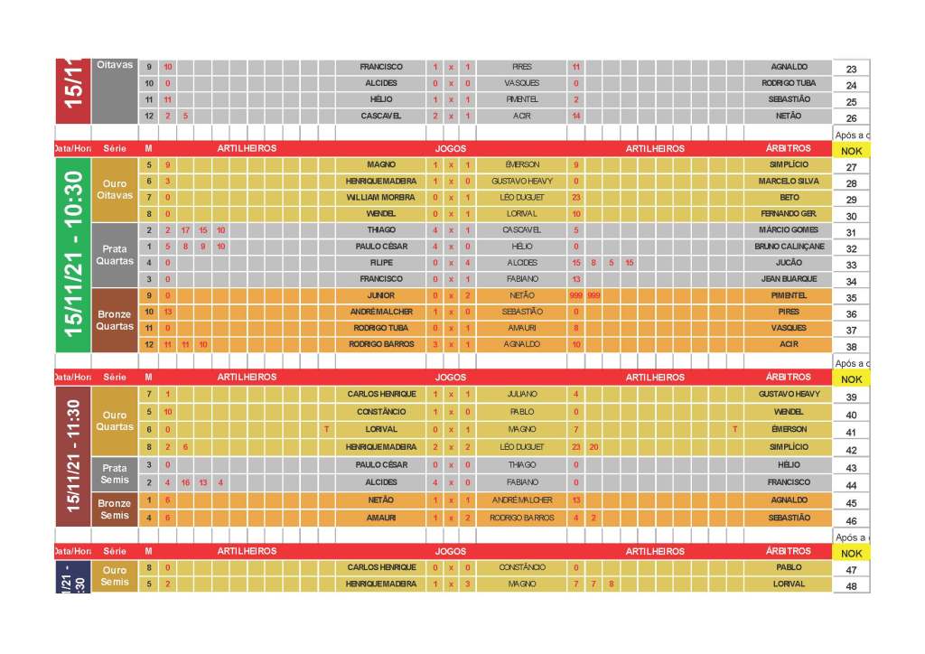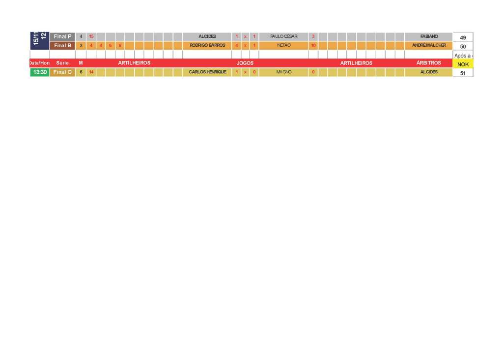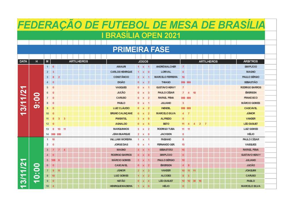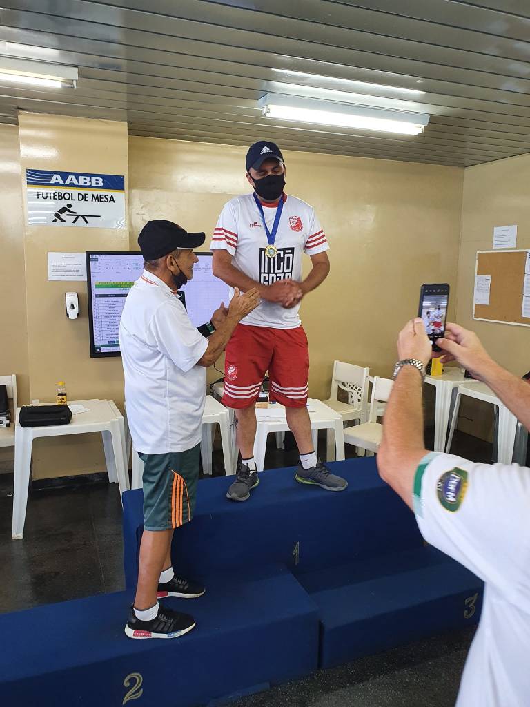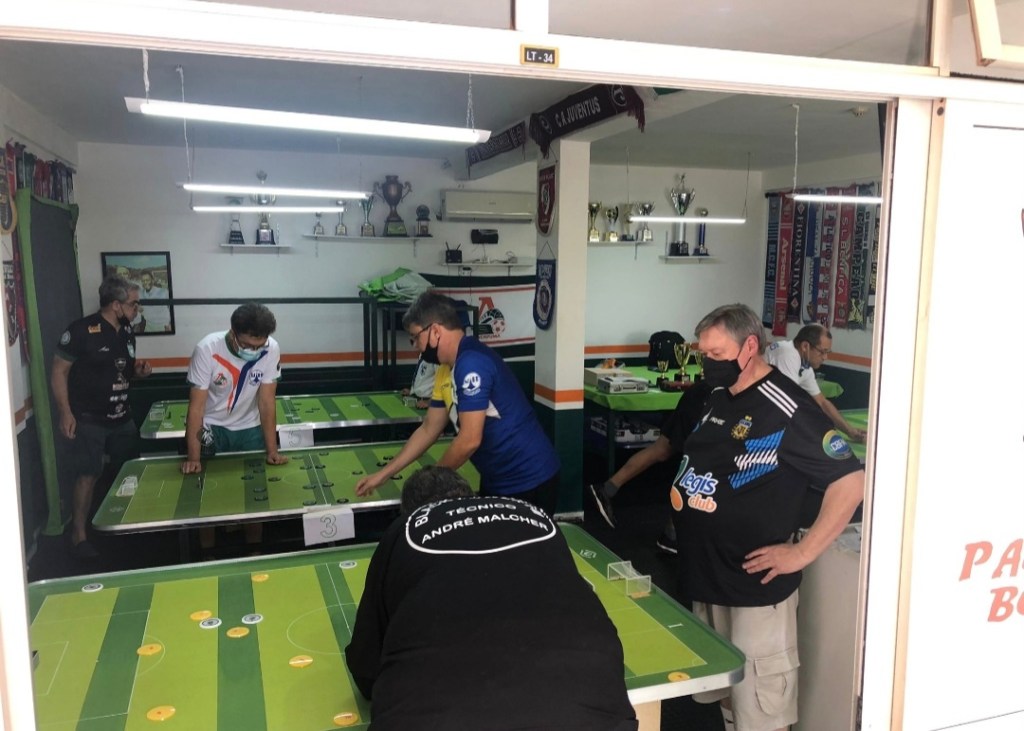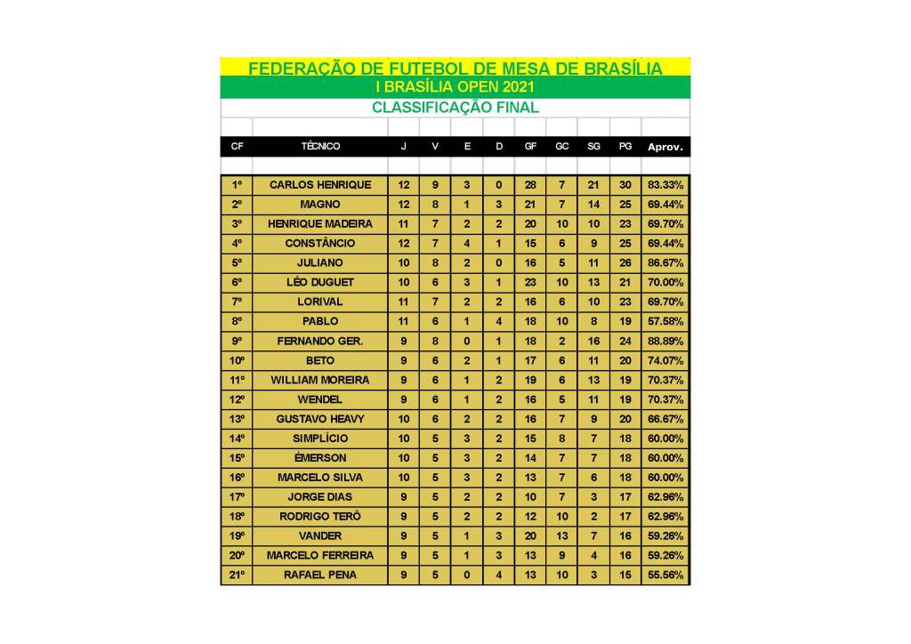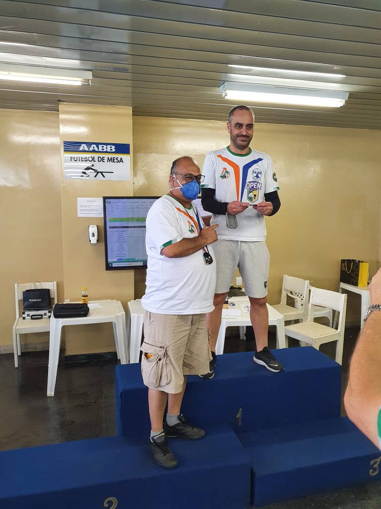 Com um evento reunindo 54 atletas do DF, MG, RJ, GO, SP, ES e ate dos EUA e 3 dias de disputa (nos dias 13, 14 e 15 de novembro), foi realizada na sede da AABB-DF o I Brasília Open. Eram 6 chaves de 9 atletas classificando os 4 primeiros pra serie ouro. A 1a Fase terminou com 24 na ouro, 16 na Prata e 14 na Bronze. Ao final dos mata-matas, a Bronze foi decidida entre Rodrigo 4×1 Netão, vencida pelo atleta da AABB / Acafuma. Na Prata, um clássico da AABB fez a final Alcides 1×1 PC, fez Alcides levar o caneco. Na serie ouro, Henrique Madeira (Vasco-RJ) ficou em 3° lugar e Carlos Henrique (Liberdade-MG) x Magno (AABB / Acafuma) fizeram a final. Apesar de CH precisar apenas do empate, conseguiu o 1×0 e se tornou campeão !! Parabéns Carlos Henrique !!Na medalha de menos vazado, Fernando Germano (Bilac-SP) foi o premiado e o Artilheiro foi Carlos Henrique do Liberdade. Agradecemos a todos os atletas que compareceram e em especial a AABB Brasília pela grande parceria.