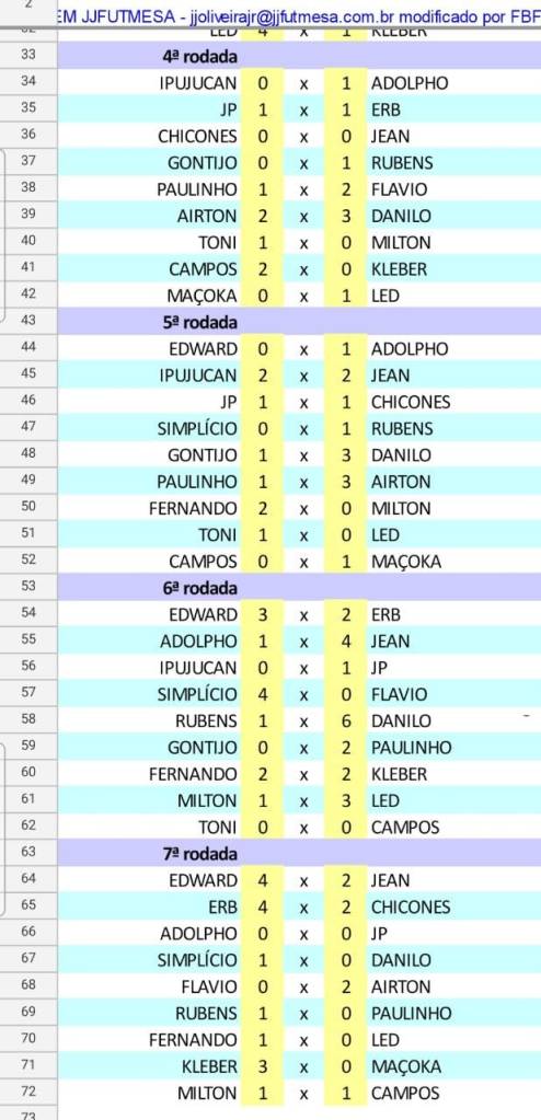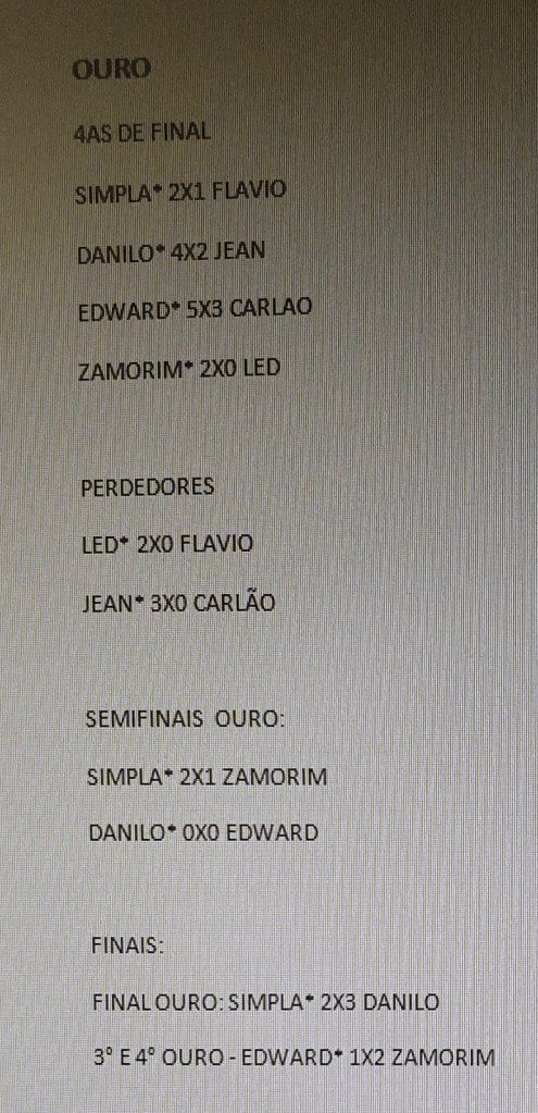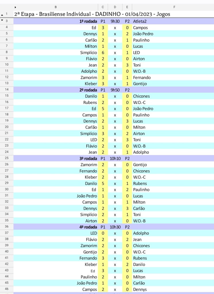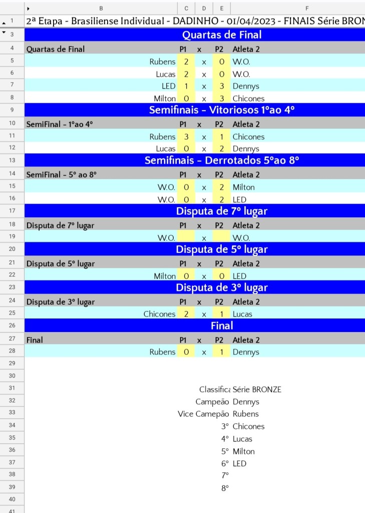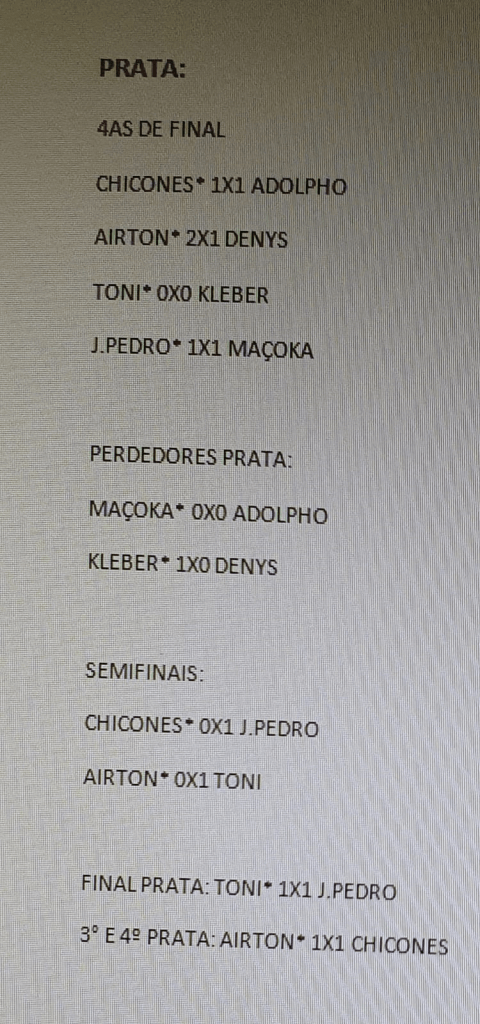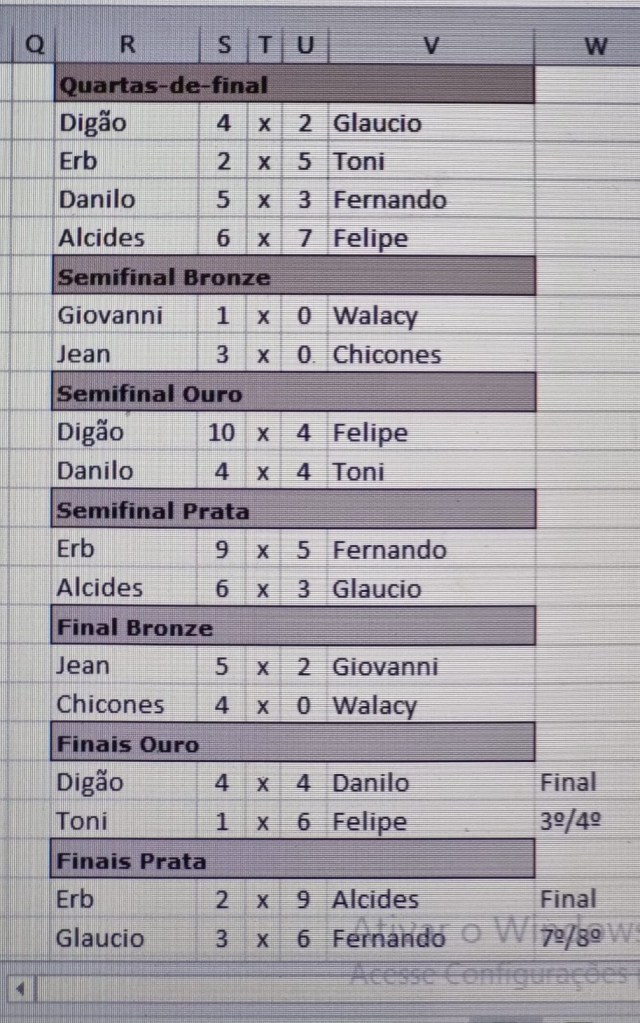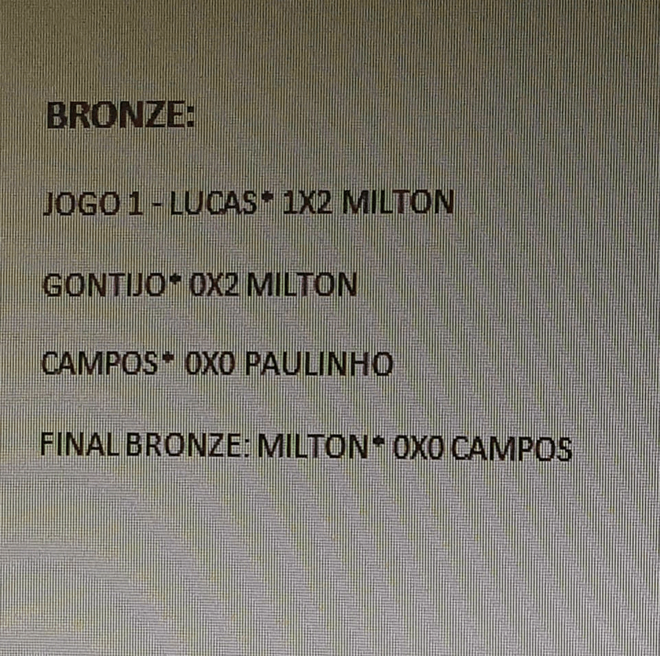 Final da 3ª Etapa – OURO: Campeão: Simpla AABB/BQ;2º: Edward AABB/BQ;3º: Fernando AABB/BQ;4º: Danilo APB;5º: Rubens AABB/BQ;6º: Led APB;7º: Erb GAMA;8º: Toni AGUIA BRANCA;PRATA: Campeão: Jean APB;10º: Airton APB;11º: Paulinho APB;12º: Kleber GAMA;13º: Joao Pedro APB;14º: Adolpho AABB/BQ;15º: Campos GAMA;16º: Maçoka APB;BRONZE:Campeão: Gontijo GAMA;18º: Ipujucan ASCADE;19º: Chicones APB;20º: Flavio GAMA;21º: Milton AABB/BQ
