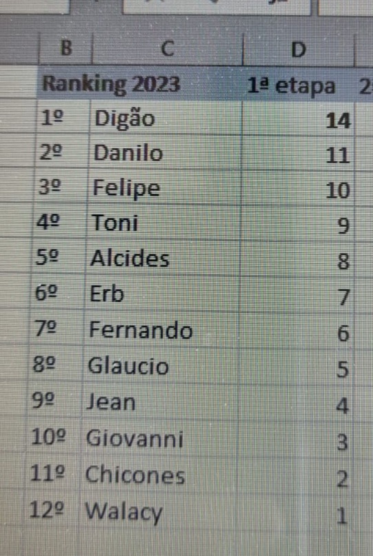 1. Digão;2.Felipe;3.Danilo;4.Helio;5. Toni;6.Alessandro;7. Milton;8.Glaucio;9.Chicones;10.JP;11.Paulinho (-1 ponto no ranking diante de penalidade por abandono a instantes do início da etapa)