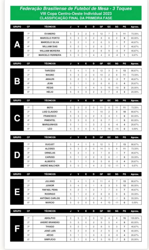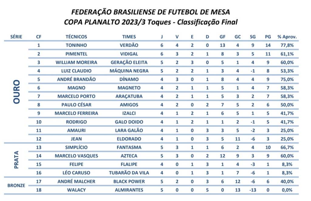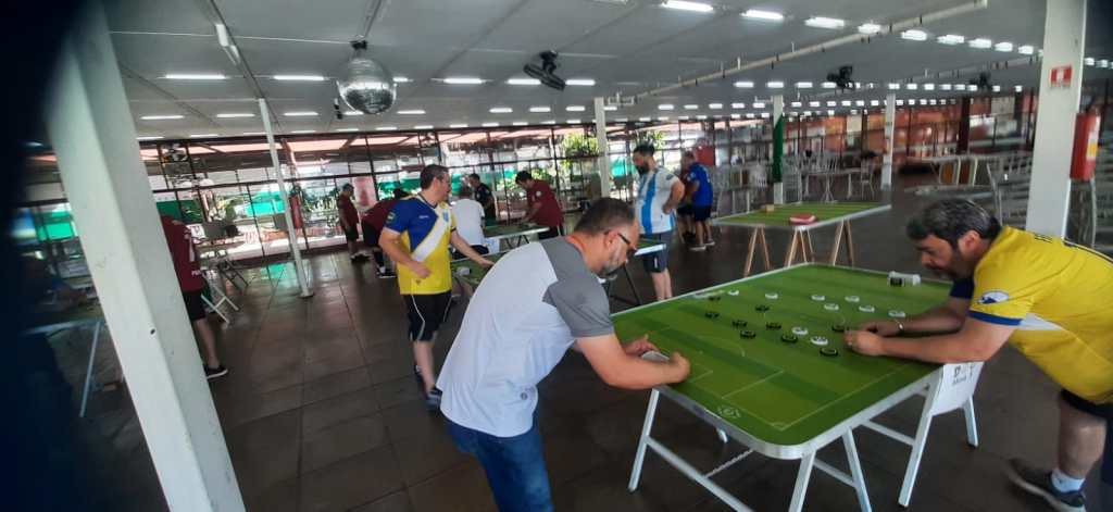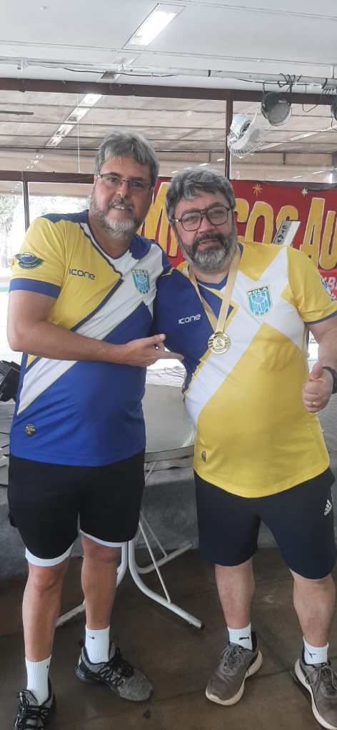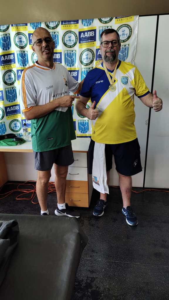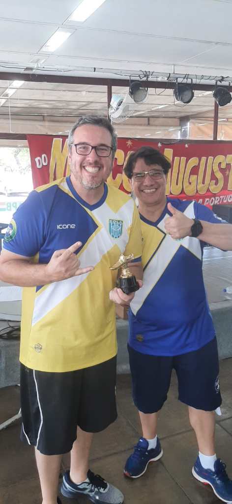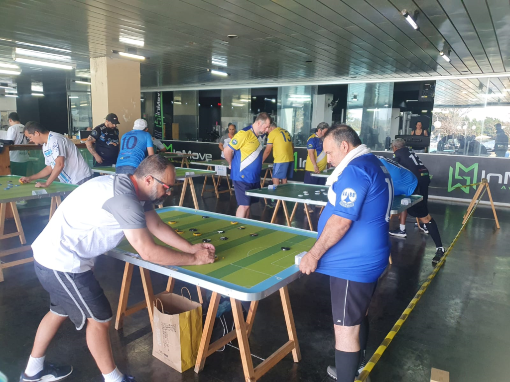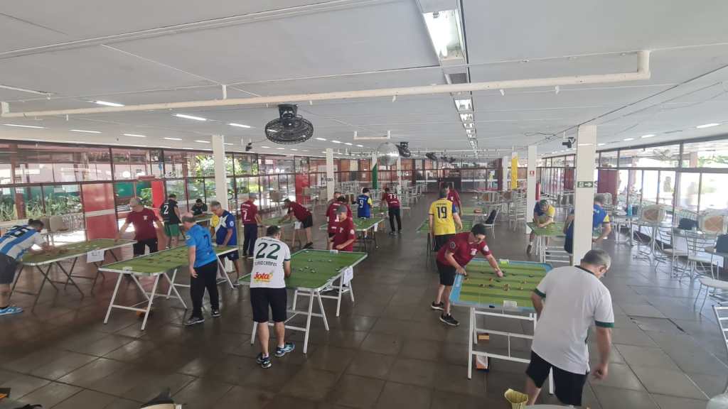 Neste final de semana, 36 tecnicos disputaram o titulo de Campeao da Centro-Oeste 2023, na modalidade 3 toques. Eram 6 grupos de 6, classificando 18, o restante indo para Prata e Bronze. Na Bronze, Aecio x Marcelo Ferreira empataram em 1×1, dando titulo ao Aecio, o 1° trofeu da nova versao da equipe da Ocidental. Na Prata, Pimentel 2×1 Jose Luis, deu o titulo ao botonista mais experiente do DF. Na ouro, Alcides 1×1 Duguet deu o tricampeao ao botonista do DF. Parabens a todos os botonistas pelo fair play e a AABB o agradecimento pela parceria de sempre.