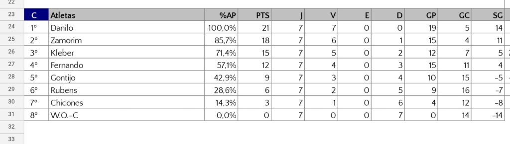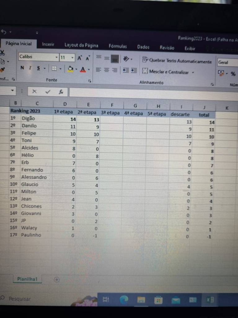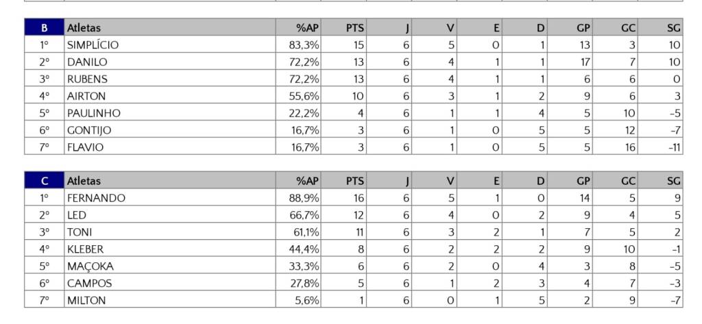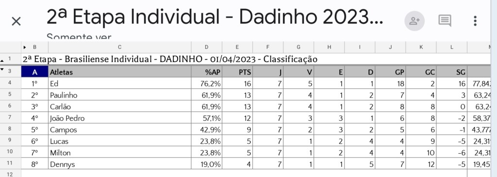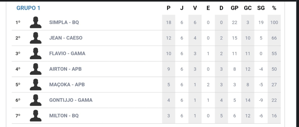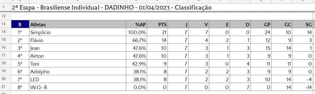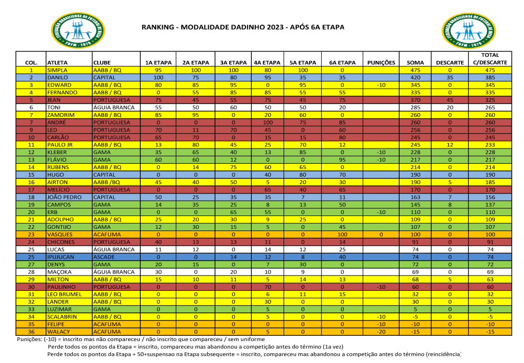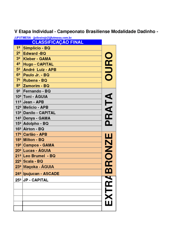 Ranking apos a 1a Etapa OURO: 1º – DANILO – Caeso – 100 pts; 2º – SIMPLA – AABB/BQ – 95 pts;3º – ZAMORIM – AABB/BQ – 85 pts;4º – EDWARD – AABB/BQ – 80 pts;5º – JEAN – Caeso – 75 pts;6º – LED – APB – 70 pts;7º – CARLÃO- Caeso – 65 pts;8º – FLÁVIO – Gama – 60 pts;PRATA:9º – TONI – Aguia Branca 55 pts;10º – J. PEDRO – Caeso – 50 pts;11º – AIRTON – APB – 45 pts;12º – CHICONES – APB – 40 pts; 13º – KLEBER – Gama – 35 pts;14º – MAÇOKA – APB – 30 pts;15º – ADOLPHO – AABB/BQ – 25 pts;16º – DENYS – Gama – 20 ptS;BRONZE: 17º – MILTON – AABB/BQ – 15 pts;18º – CAMPOS – Gama – 14 pts;19º – PAULINHO – APB –13 pts;20º – GONTIJO – Gama –12 pts;21º – LUCAS – CEPI – 11 pts;22º – WALACY – Acafuma – (-10) pts