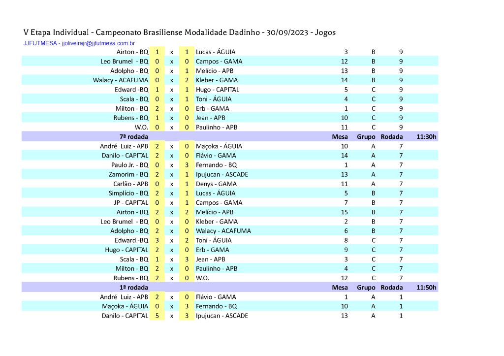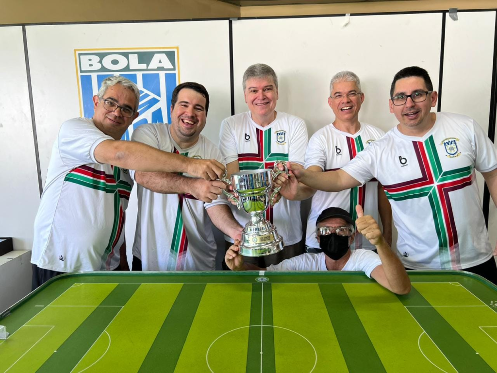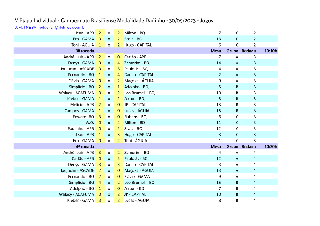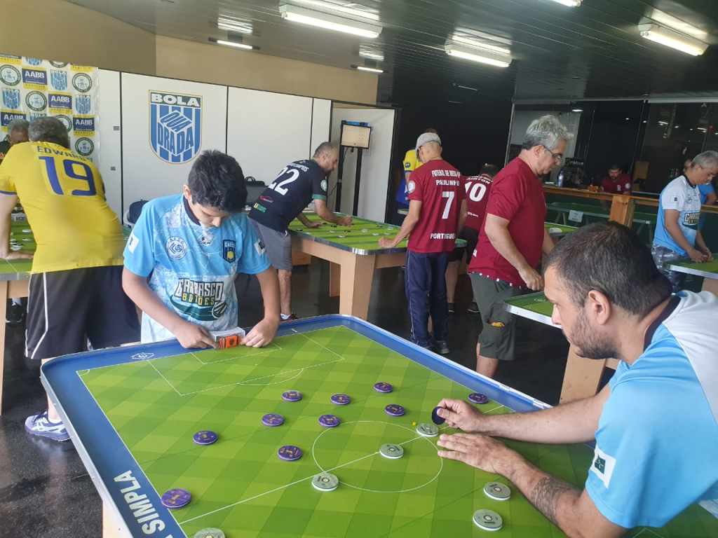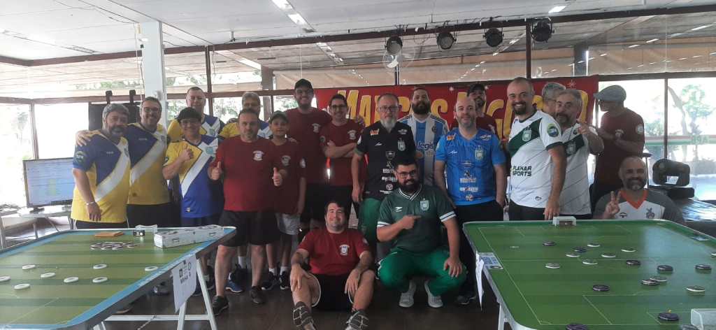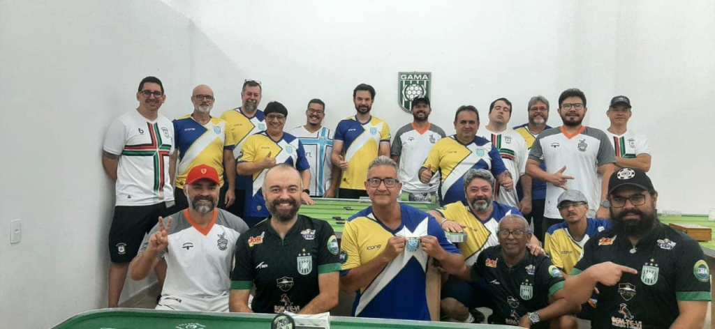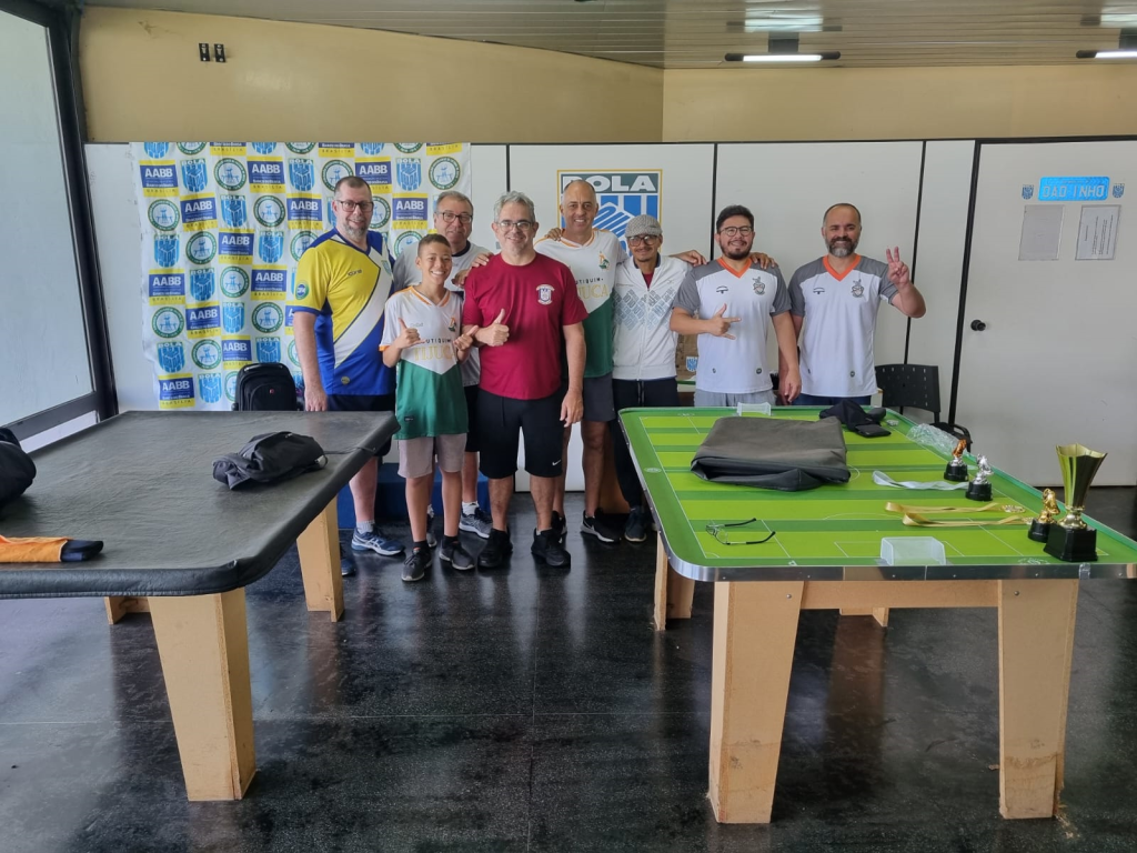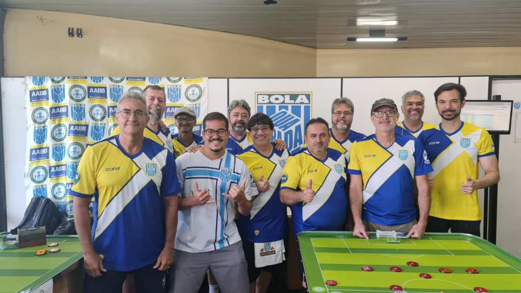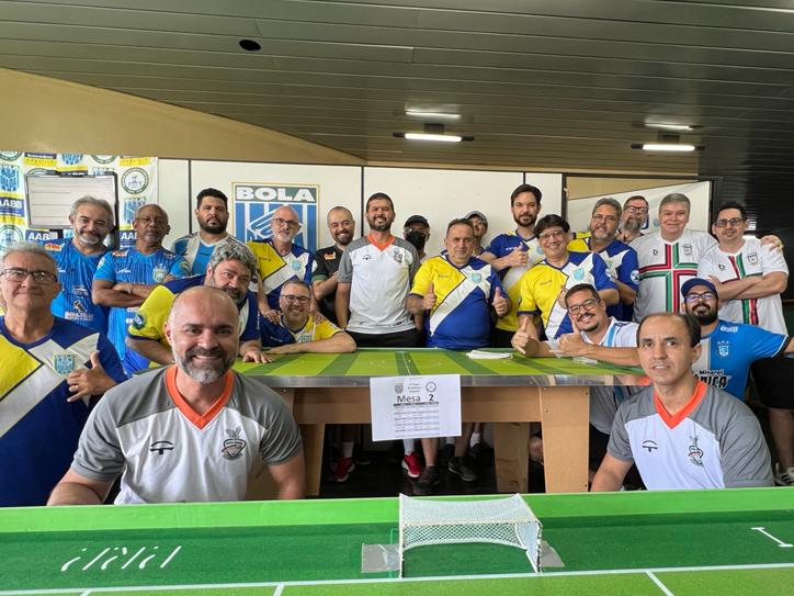 Após 4 etapas do Campeonato Brasiliense de Futebol de Mesa, modalidade dadinho, ao longo de 2023, a equipe A do BQ/AABB pôde comemorar o título. O time, capitaneado pelo veterano Fernando, venceu as duas primeiras etapas, deixando as outras duas etapas para o time da Portuguesa de Brasília, ambas equipes finalizando com 390 pontos ao longo da temporada. Muita disputa durante todo o ano. Entretanto, o Bola Quadrada levou a melhor nos critérios de desempate: maior número de pontos ganhos somadas as 4 Etapas do ano.Assim, encerra-se o calendário de 2023 da FBFM-DF.Agradecemos a todos os participantes e esperamos que 2024 tenha as outras equipes em campo e muito mais dadinho na rede para abrilhantar ainda mais a competição local.Agradecemos a AABB/DF pela receptividade de sempre!Ranking final:1º- BQ/AABB (A) – 390 pts 53 PG;2º- Portuguesa (A) – 390 pts 49 PG;3º- BQ/AABB (B) – 255 pts;4º- Gama – 240 pts;5º- Águia Branca – 80 pts 5 PG;6º- Portuguesa (B) – 80 pts 1 PG.