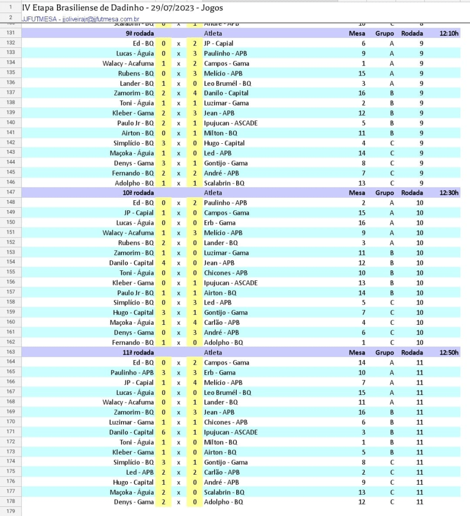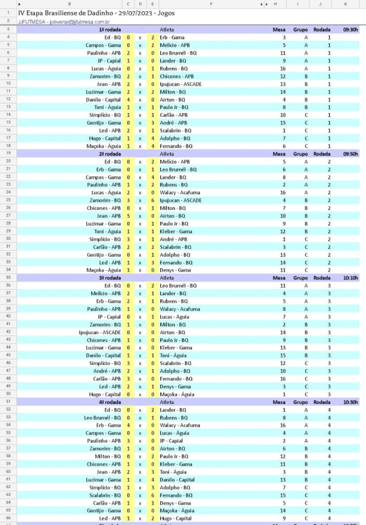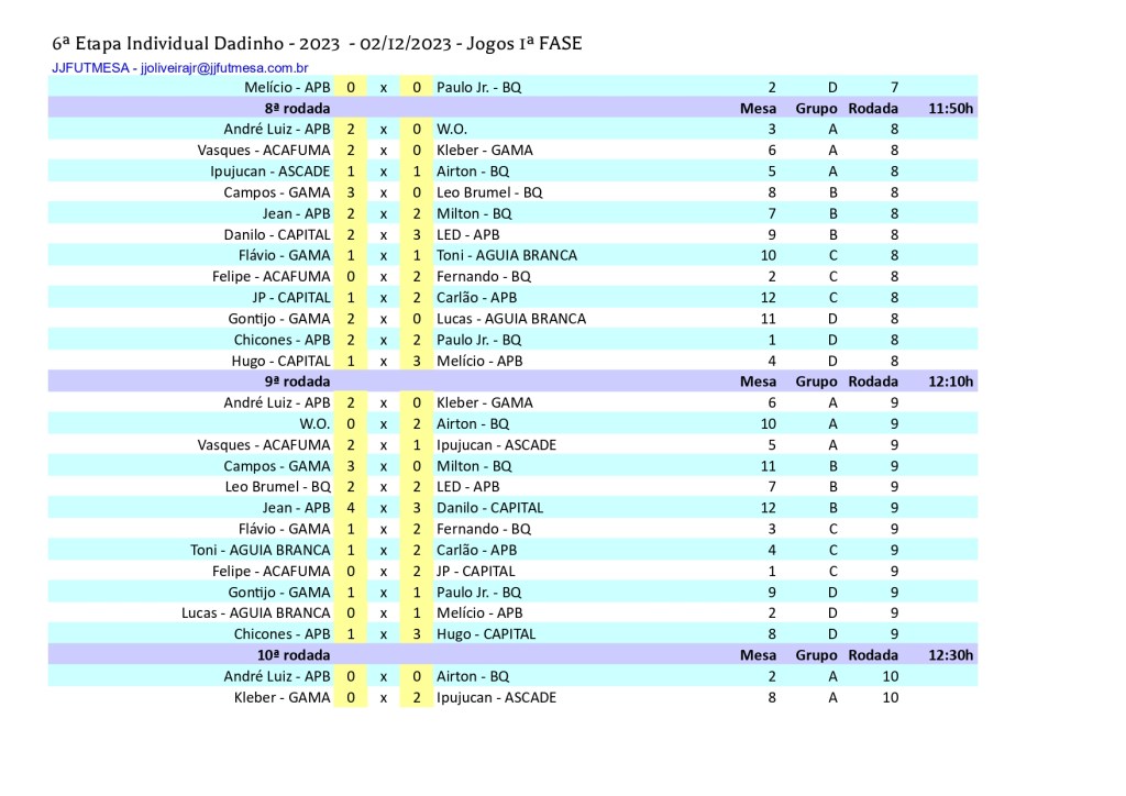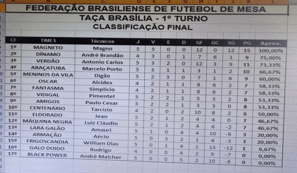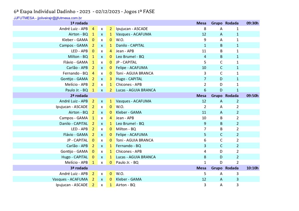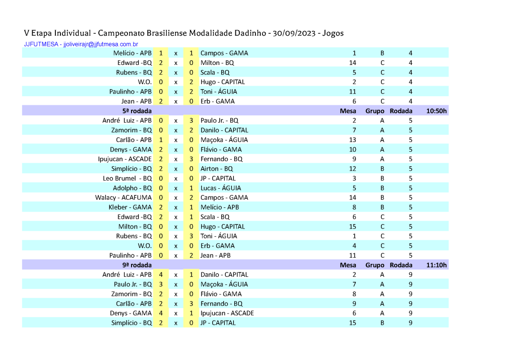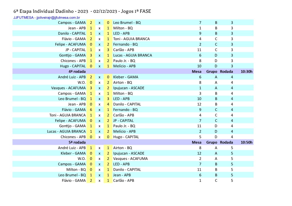 Após 4 etapas do Campeonato Brasiliense de Futebol de Mesa, modalidade dadinho, ao longo de 2023, a equipe A do BQ/AABB pôde comemorar o título. O time, capitaneado pelo veterano Fernando, venceu as duas primeiras etapas, deixando as outras duas etapas para o time da Portuguesa de Brasília, ambas equipes finalizando com 390 pontos ao longo da temporada. Muita disputa durante todo o ano. Entretanto, o Bola Quadrada levou a melhor nos critérios de desempate: maior número de pontos ganhos somadas as 4 Etapas do ano.Assim, encerra-se o calendário de 2023 da FBFM-DF.Agradecemos a todos os participantes e esperamos que 2024 tenha as outras equipes em campo e muito mais dadinho na rede para abrilhantar ainda mais a competição local.Agradecemos a AABB/DF pela receptividade de sempre!Ranking final:1º- BQ/AABB (A) – 390 pts 53 PG;2º- Portuguesa (A) – 390 pts 49 PG;3º- BQ/AABB (B) – 255 pts;4º- Gama – 240 pts;5º- Águia Branca – 80 pts 5 PG;6º- Portuguesa (B) – 80 pts 1 PG.