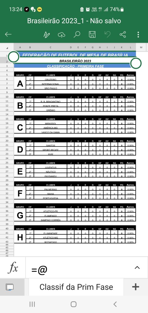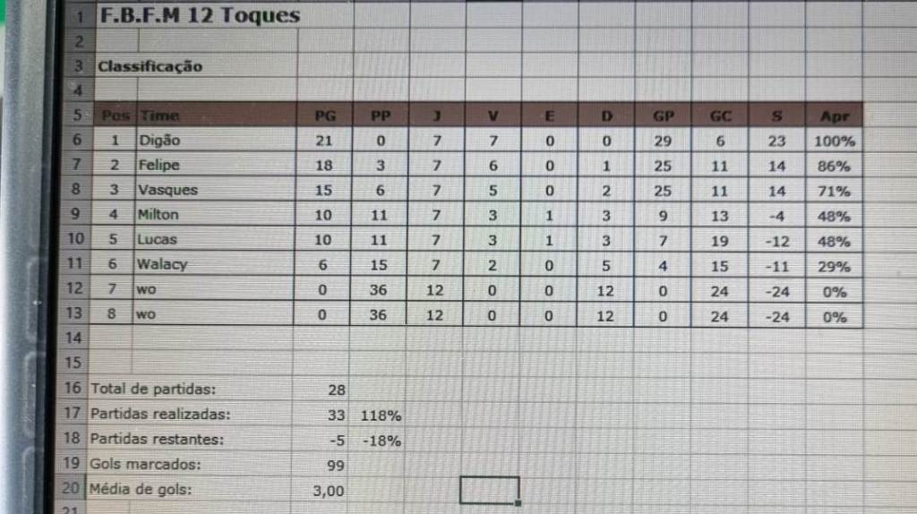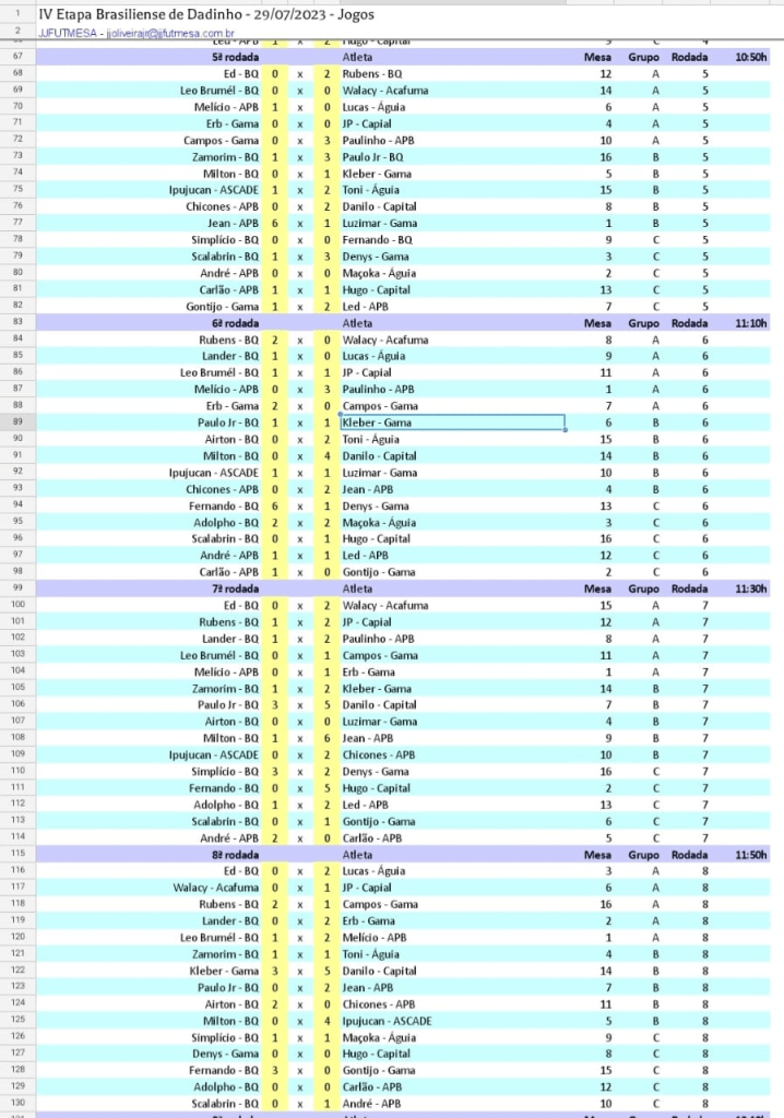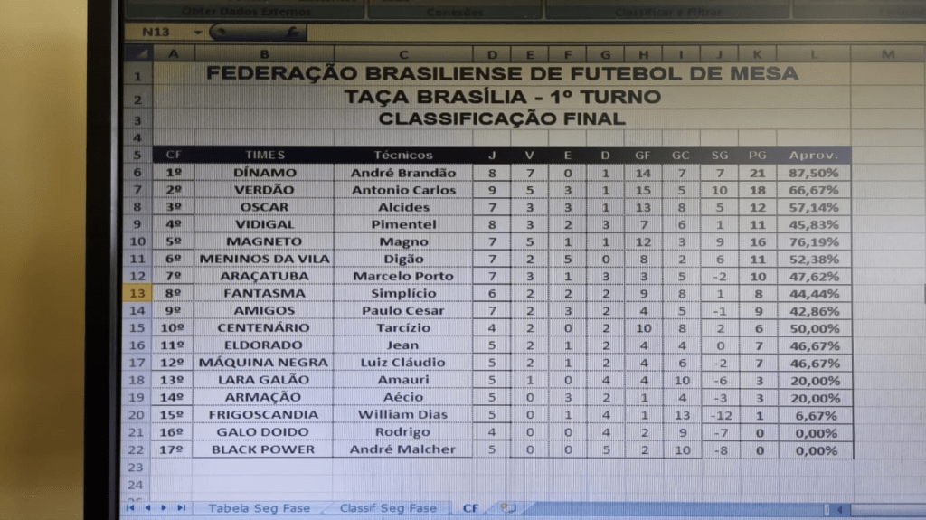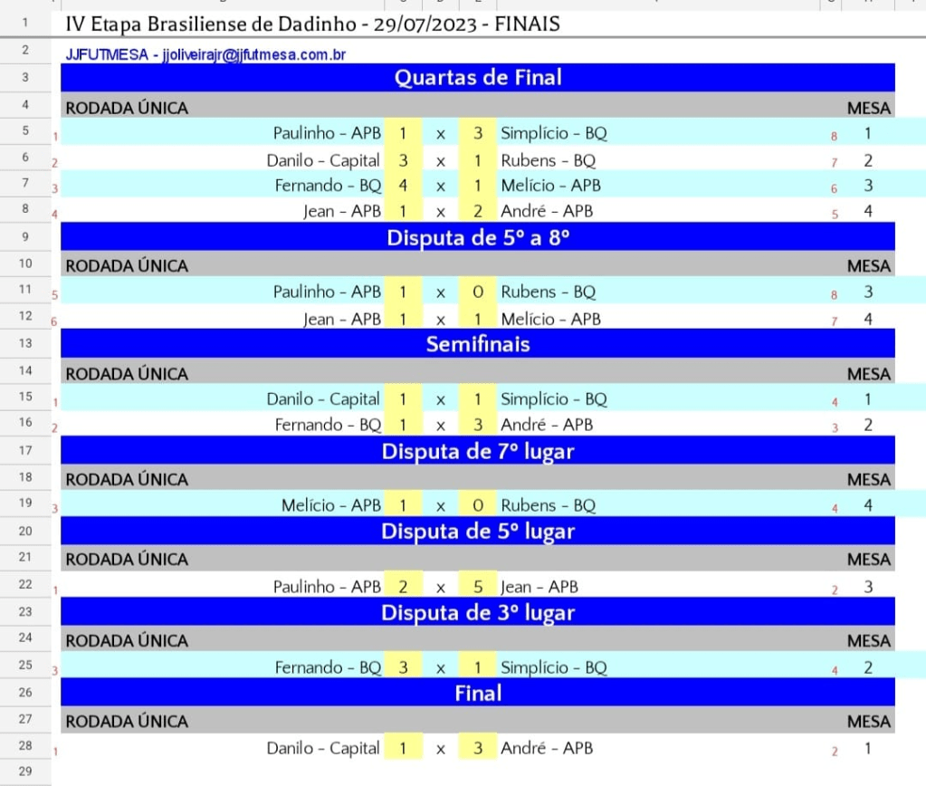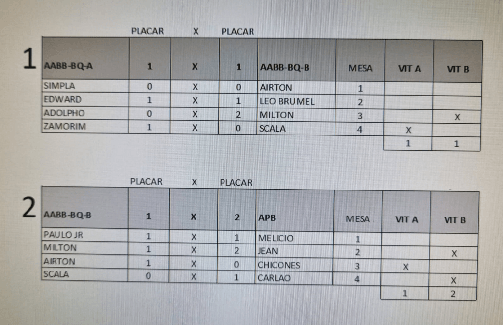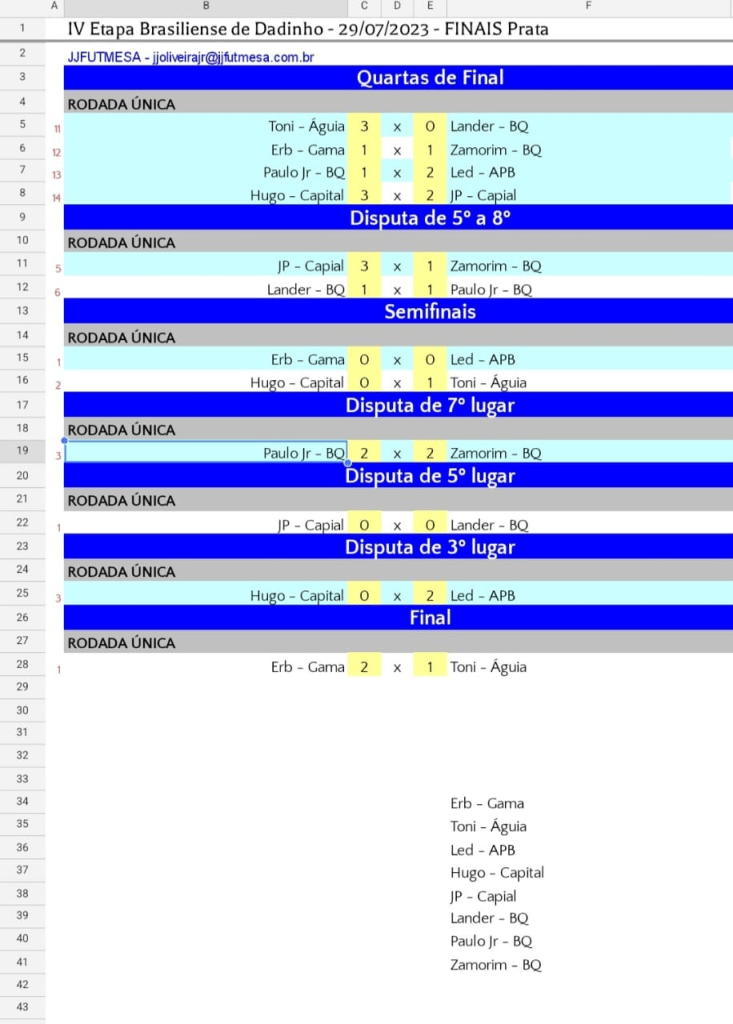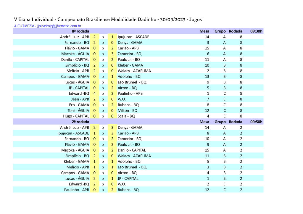 Após 4 etapas do Campeonato Brasiliense de Futebol de Mesa, modalidade dadinho, ao longo de 2023, a equipe A do BQ/AABB pôde comemorar o título. O time, capitaneado pelo veterano Fernando, venceu as duas primeiras etapas, deixando as outras duas etapas para o time da Portuguesa de Brasília, ambas equipes finalizando com 390 pontos ao longo da temporada. Muita disputa durante todo o ano. Entretanto, o Bola Quadrada levou a melhor nos critérios de desempate: maior número de pontos ganhos somadas as 4 Etapas do ano.Assim, encerra-se o calendário de 2023 da FBFM-DF.Agradecemos a todos os participantes e esperamos que 2024 tenha as outras equipes em campo e muito mais dadinho na rede para abrilhantar ainda mais a competição local.Agradecemos a AABB/DF pela receptividade de sempre!Ranking final:1º- BQ/AABB (A) – 390 pts 53 PG;2º- Portuguesa (A) – 390 pts 49 PG;3º- BQ/AABB (B) – 255 pts;4º- Gama – 240 pts;5º- Águia Branca – 80 pts 5 PG;6º- Portuguesa (B) – 80 pts 1 PG.