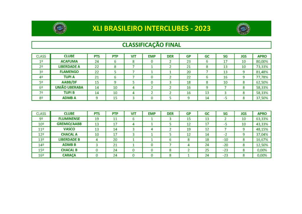 Flamengo, obtida no final do confronto contra a equipe de Uberaba (MG). Pelas semifinais, continuavam com a vantagem do empate as equipes de melhor Classificação na primeira fase (Flamengo e Liberdade “A”). No entanto, a presença da forte equipe da ACAFUMA e do Tupi, este último multicampeão brasileiro, trazia a promessa de jogos disputadíssimos. Na primeira semifinal, o Liberdade “A” superou a equipe da casa (Tupi), pelo placar geral de 2 a 1, credenciando a equipe de Belo Horizonte a mais uma final da competição, na qual defenderia seu título de Campeão Brasileiro de 2022. Na segunda semifinal, a equipe do Flamengo começou bem o confronto, sendo que no intervalo estava se classificando para a final. No entanto, no segundo tempo a ACAFUMA conseguiu reverter o placar adverso, para vencer a partida por 2 a 1. Na finalíssima, o duelo entre Liberdade “A” e ACAFUMA era imprevisível. Jogando pelo empate, a equipe mineira lutou ao máximo, mas encontrou o time de Brasília extremamente afiado. Ao final, o placar de 2 a 1 fez com que a Águas Claras Associação de Futebol de Mesa e Arte (ACAFUMA) pudesse saborear um inédito e mais do que merecido título para o clube do Distrito Federal.