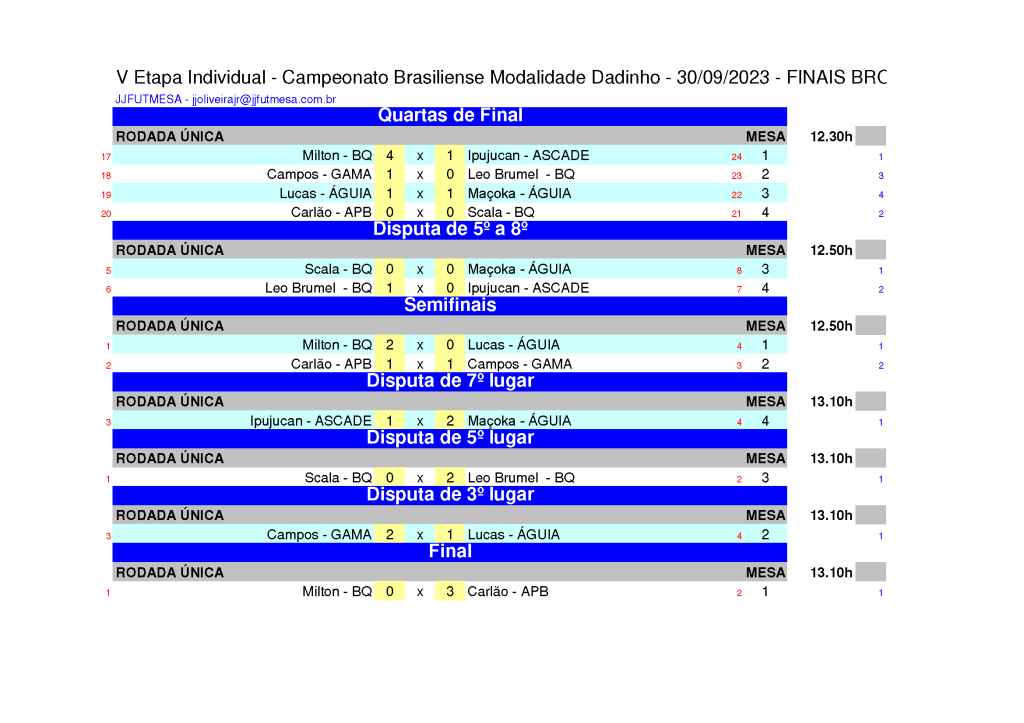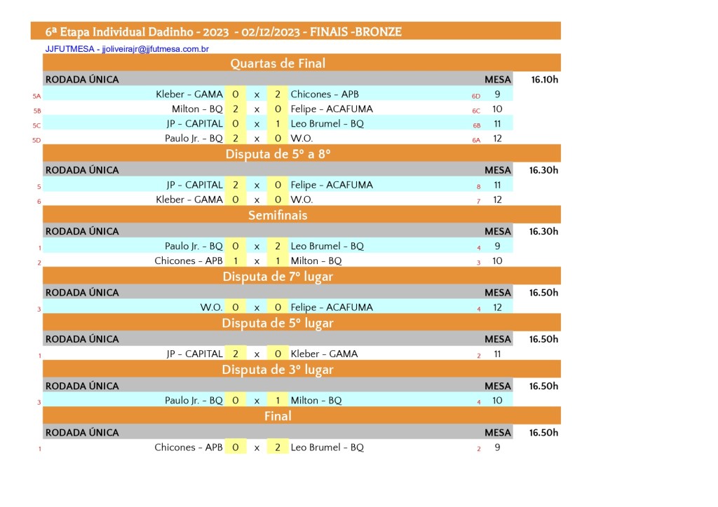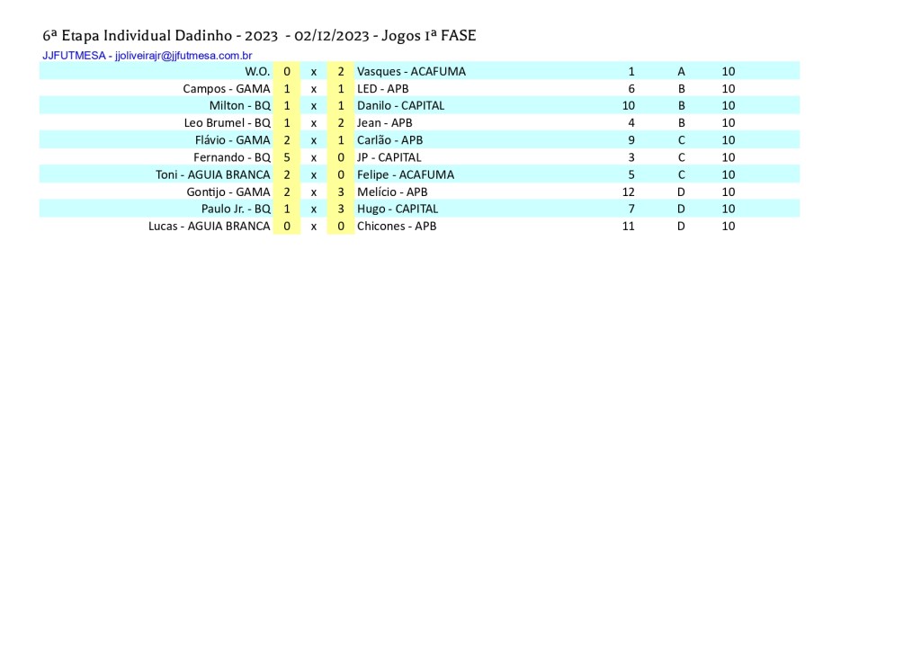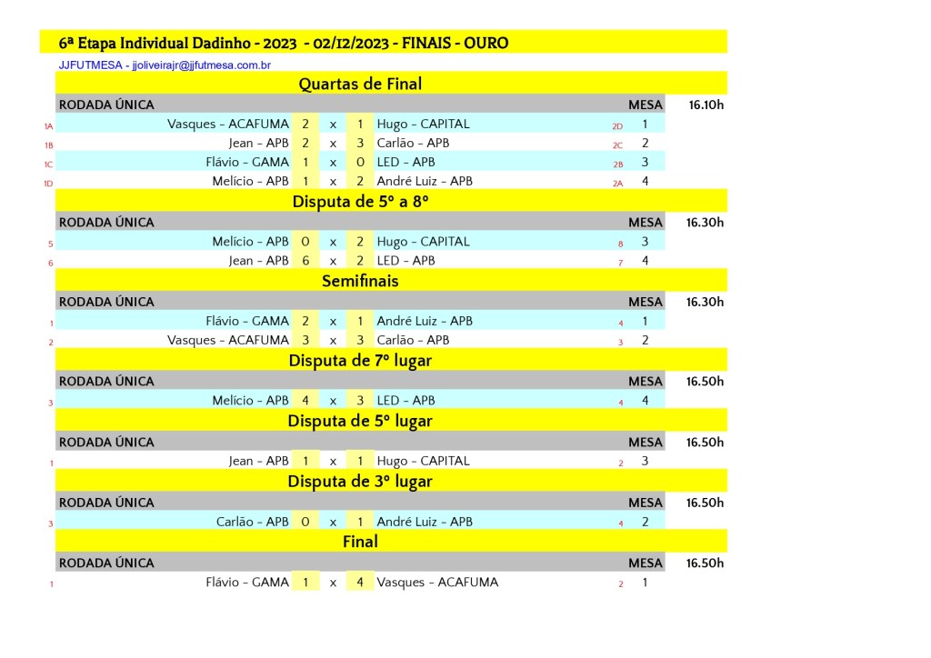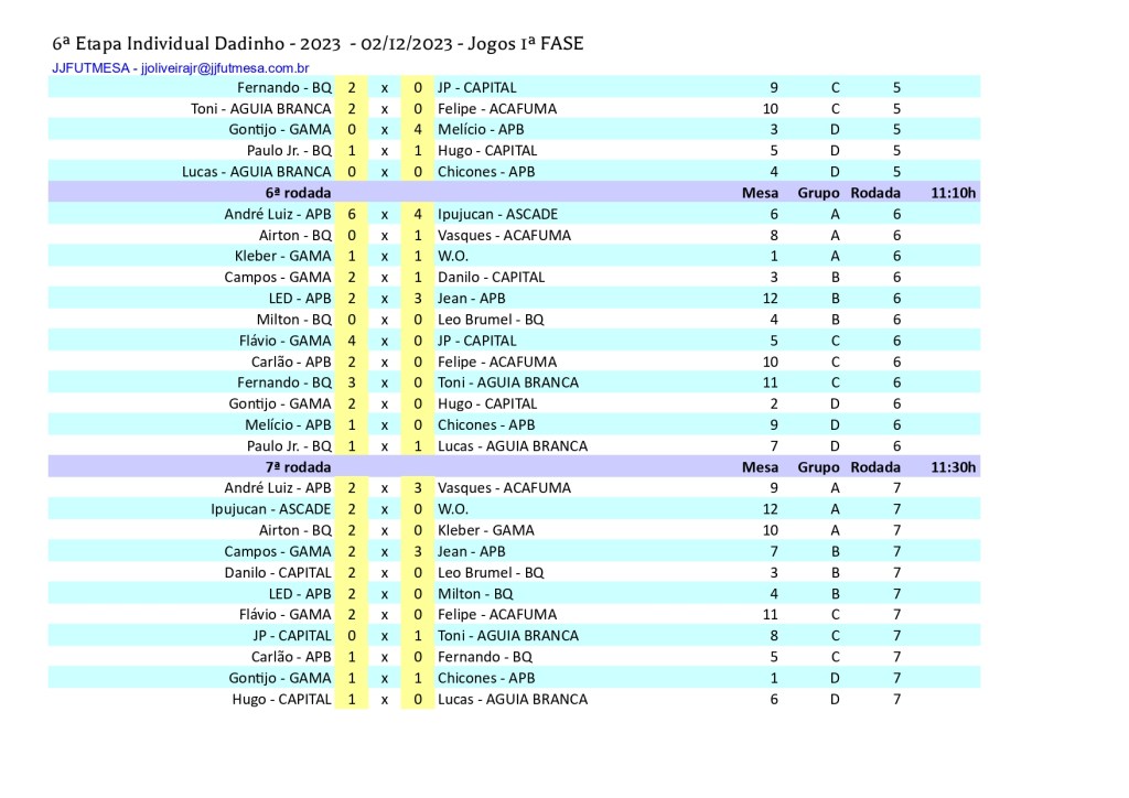 Com a realização da 6ª e última Etapa do Brasiliense de Dadinho Individual, a briga era pelo vice-campeonato geral, uma vez que o título já tinha um dono, Simplicio – AABB/BQ. Do início ao fim da primeira fase (10 jogos), as disputas para se classificar para o Série Ouro foram intensas.Na grande final, Flávio abriu 1×0, mas Vasques, com a cabeça no lugar, conseguiu virar a partida para 4×1, levando o troféu de 1º colocado na 6ª Etapa.Fernando, AABB/BQ, foi campeão da Série Prata, contra Campos, do Gama, por 2×1, enquanto Léo Brumel, AABB/BQ, foi campeão da Bronze, contra Chicones, da Portuguesa por 2×0.Série Ouro:1º – Vasques – ACAFUMA – (campeão);2º- Flavio Oliveira – Gama – (Vice-campeão);3º- André Luiz – Portuguesa;4º- Carlão – Portuguesa;5º- Jean – Portuguesa;6º- Hugo – Capital;7º- Melício – Portuguesa;8º- Led – Portuguesa;Série Prata:9º- Fernando – AABB/BQ – (Campeão);10º- Campos – Gama – (Vice-campeão);11º- Gontijo – Gama;12º- Ipujucan – ASCADE;13º- Danilo – Capital;14º- Airton – AABB/BQ;15º- Lucas – Águia Branca;16º- Toni – Águia Branca;Série Bronze:17º- Léo Brumel – AABB/BQ – (Campeão);18º- Chicones – Portuguesa – (Vice-campeão);19º- Milton – AABB/BQ;20- Paulo Jr – AABB/BQ;21º- JP – Capital;22º- Felipe – ACAFUMA;23º- Kleber – Gama;Vale destacar o troféu Fair Play entregue ao atleta Milton, AABB/BQ, por sua presteza e dedicação com a FBFM.A Federação Brasiliense de Futebol de Mesa agradece a hospitalidade da @esportesaabbdf @aabbbrasilia pela receptividade aos atletas.