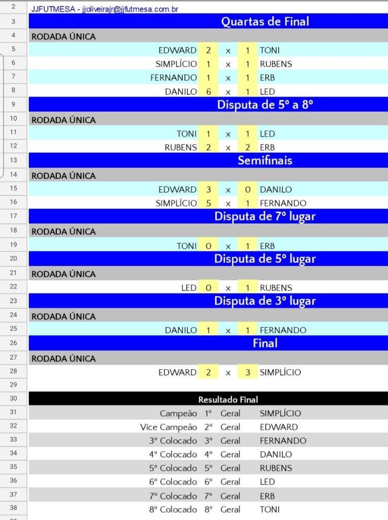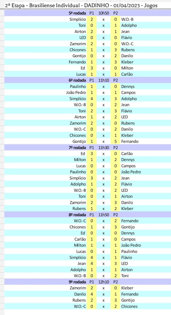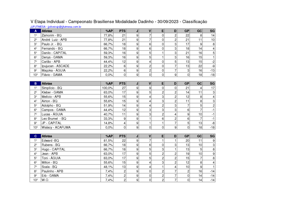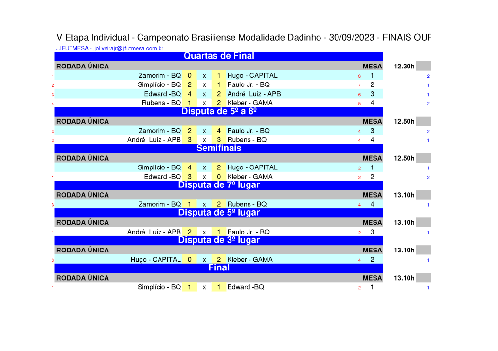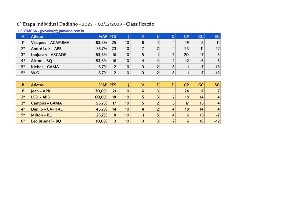Com a realização da 6ª e última Etapa do Brasiliense de Dadinho Individual, a briga era pelo vice-campeonato geral, uma vez que o título já tinha um dono, Simplicio – AABB/BQ. Do início ao fim da primeira fase (10 jogos), as disputas para se classificar para o Série Ouro foram intensas.Na grande final, Flávio abriu 1×0, mas Vasques, com a cabeça no lugar, conseguiu virar a partida para 4×1, levando o troféu de 1º colocado na 6ª Etapa.Fernando, AABB/BQ, foi campeão da Série Prata, contra Campos, do Gama, por 2×1, enquanto Léo Brumel, AABB/BQ, foi campeão da Bronze, contra Chicones, da Portuguesa por 2×0.Série Ouro:1º – Vasques – ACAFUMA – (campeão);2º- Flavio Oliveira – Gama – (Vice-campeão);3º- André Luiz – Portuguesa;4º- Carlão – Portuguesa;5º- Jean – Portuguesa;6º- Hugo – Capital;7º- Melício – Portuguesa;8º- Led – Portuguesa;Série Prata:9º- Fernando – AABB/BQ – (Campeão);10º- Campos – Gama – (Vice-campeão);11º- Gontijo – Gama;12º- Ipujucan – ASCADE;13º- Danilo – Capital;14º- Airton – AABB/BQ;15º- Lucas – Águia Branca;16º- Toni – Águia Branca;Série Bronze:17º- Léo Brumel – AABB/BQ – (Campeão);18º- Chicones – Portuguesa – (Vice-campeão);19º- Milton – AABB/BQ;20- Paulo Jr – AABB/BQ;21º- JP – Capital;22º- Felipe – ACAFUMA;23º- Kleber – Gama;Vale destacar o troféu Fair Play entregue ao atleta Milton, AABB/BQ, por sua presteza e dedicação com a FBFM.A Federação Brasiliense de Futebol de Mesa agradece a hospitalidade da @esportesaabbdf @aabbbrasilia pela receptividade aos atletas.