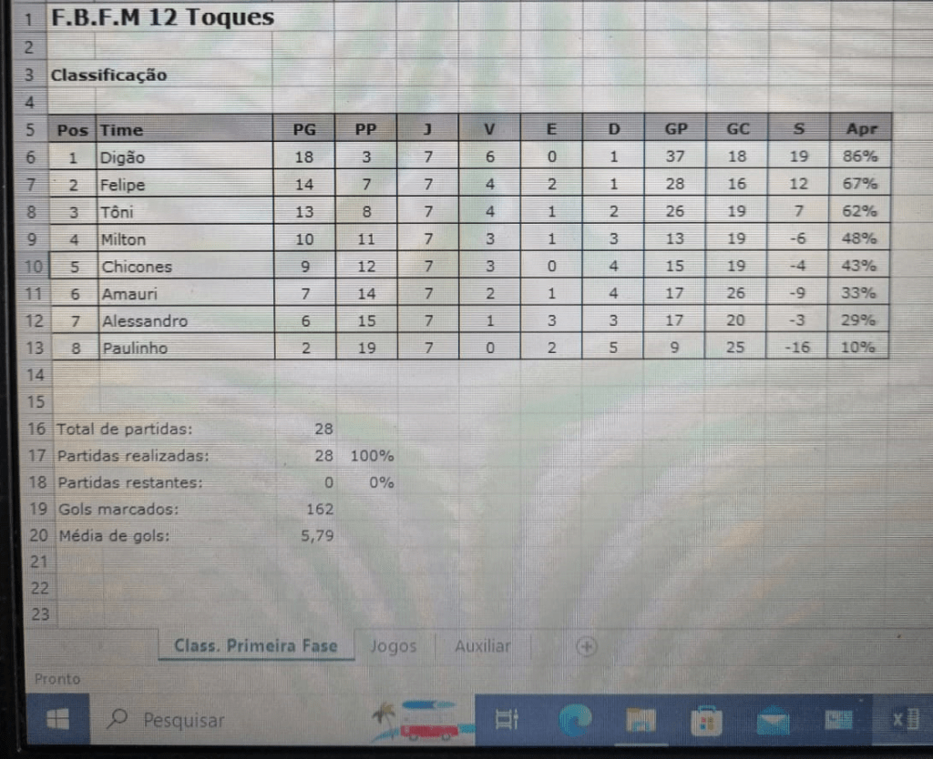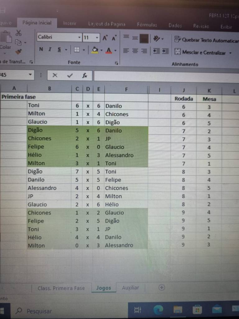 Neste sabado, 11/02, na sede da AABB – Bola Quadrada, 12 atletas disputaram a 1a Etapa Brasiliense de 12 Toques 2023. No Grupo A, Digao (Acafuma) 15, Erb (Gama) 12, Felipe (Acafuma) e Fernando (AABB) 7 se classificaram. No Grupo B, Danilo (Caeso) 12, Alcides (AABB)10, Toni (Aguia Branca) 9 e Glaucio (Acafuma) 7 se classificaram. Apos varios jogos, chegamos as finais. Na final da Bronze, Jean(Acafuma) venceu 5×2 Giovanni (Aguia Branca) e levou o caneco. Na Prata, Alcides(AABB) venceu 9×2 Erb (Gama) e levou o prateado. Na finalissima, um 4×4 nervoso entre Danilo x Digao definiu o caneco a favor do atleta da Acafuma.Parabens !! Agradecemos a todos pelo fair play e a AABB pela parceria de sempre. Classificacao Geral: 1-Digao – Campeao Ouro;2-Danilo;3-Felipe;4-Toni;5-Alcides – Prata;6-Erb;7-Fernando;8-Glaucio;9-Jean – Bronze;10- Giovanni;11-Chicones;12-Walacy;