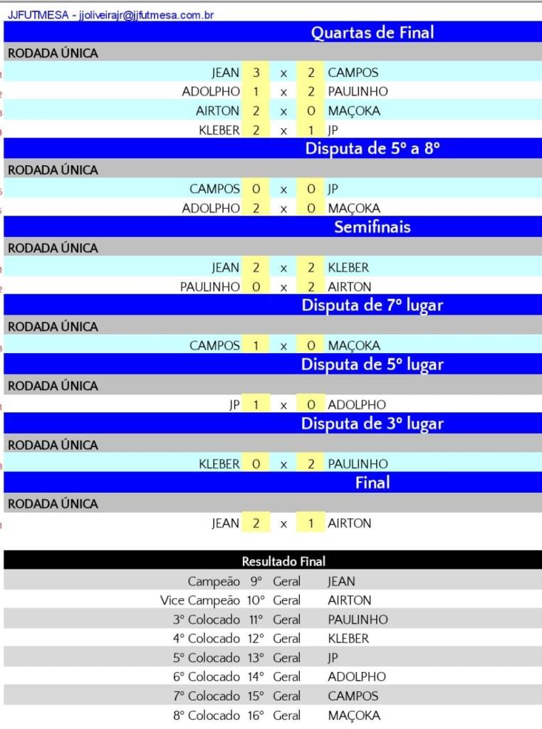 Classificacao final: 1 – Digao – Acafuma 18 pontos;2 – Felipe – Acafuma 14;3 – Toni – Aguia Branca 13;4 – Milton – AABB-BQ – 10;5 – Chicones – Portuguesa 9;6 – Amauri – AABB 7;7 – Alessandro – Aguia Branca – 6;8 – Paulo JR – Portuguesa – 2