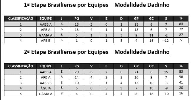 2ª Etapa por Equipes :1º – AABB A – 100 pontos;2º – APB A – 95 pontos;3º – AABB B – 85 pontos;4º – Águia – 80 pontos;5º – Gama – 75 pontos;