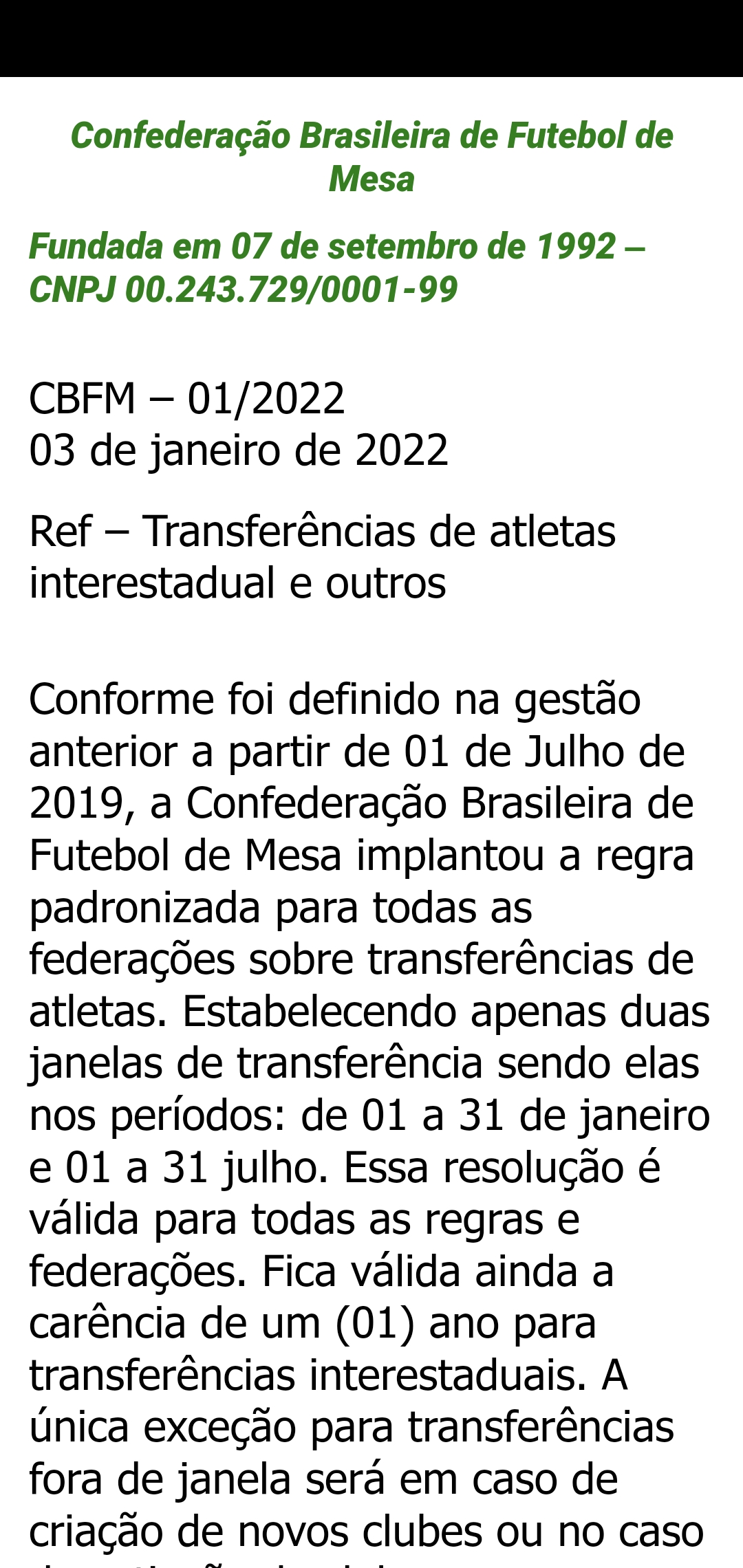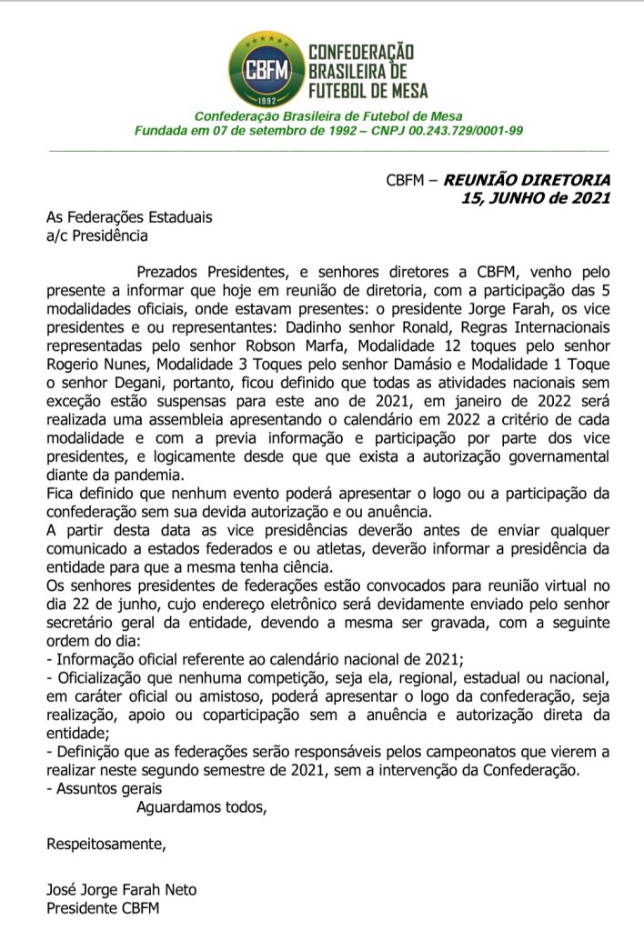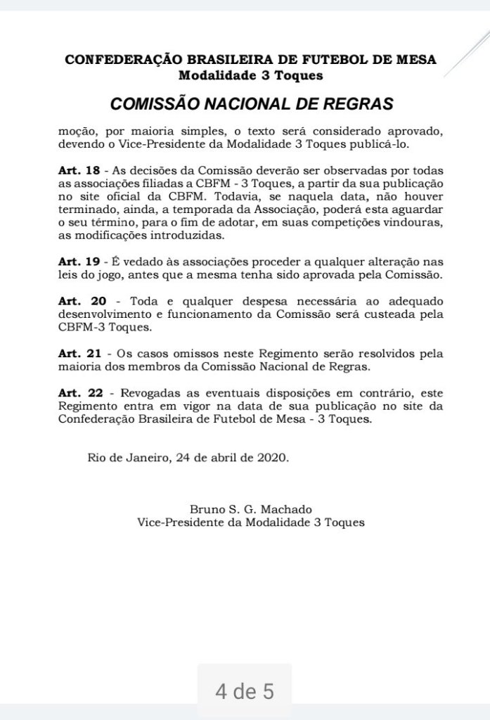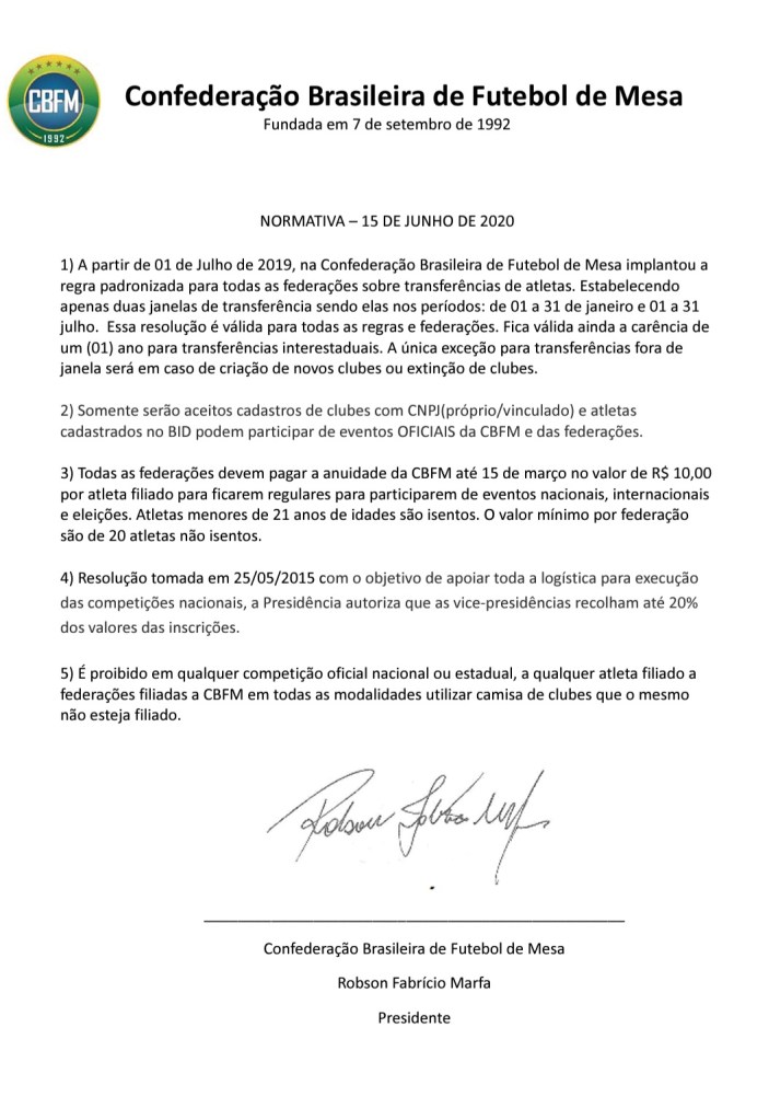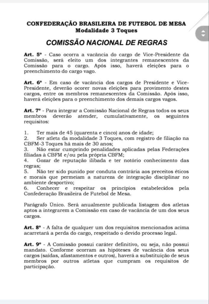 O vice presidente da CBFM, modalidade bola 3 toques, no exercício de suas atribuições, e considerando a homologação do resultado da votação universal realizada, resolve: