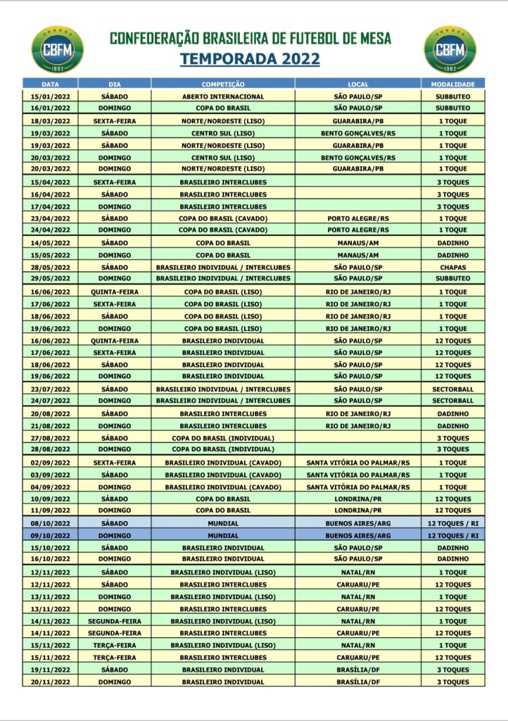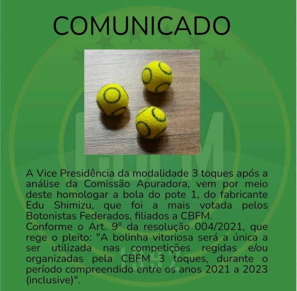 Art. 1° A bolinha a ser empregada nas competições regidas e/ou organizadas pela CBFM 3 toques no período compreendido entre 2021 e 2023 (inclusive) será a do pote 1 (EVA amarela), do fornecedor Eduardo Schimizu.