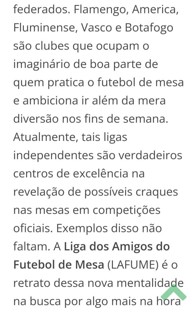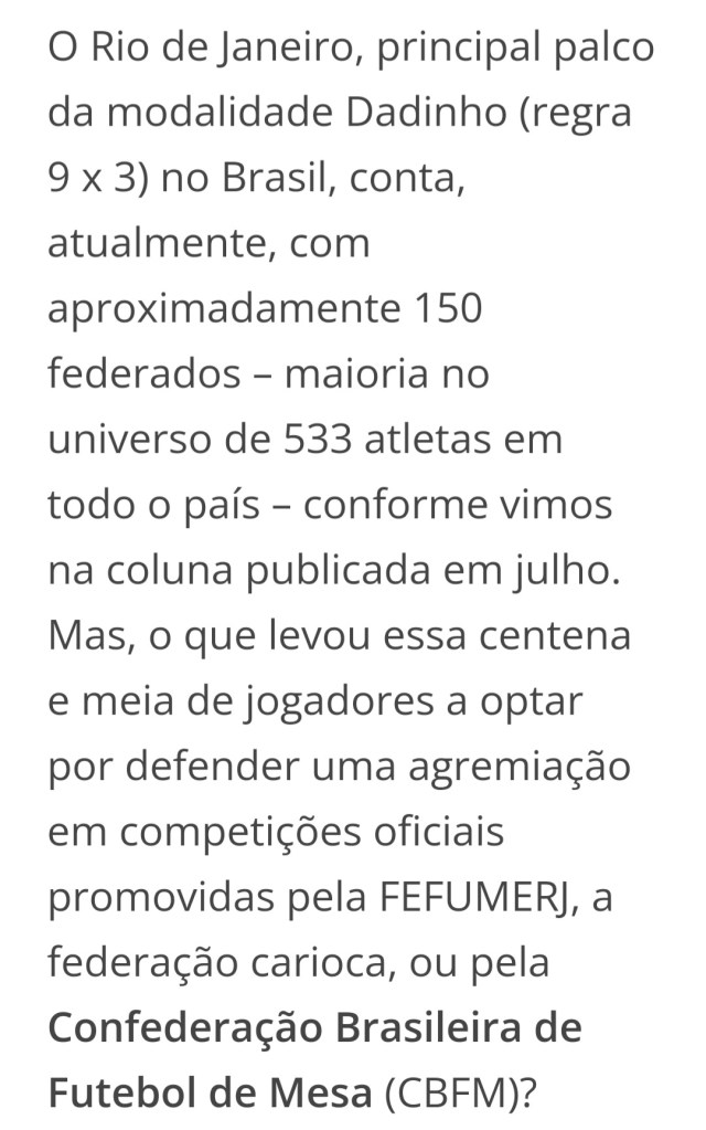 “Sua origem é incerta, mas tudo indica que ela pertence ao Brasil. Relatos de antigos colecionadores contam que marmanjos do Pará já brincavam de fazer gols com pequenos botões por volta da década de 20. Logo, o jogo chegaria ao Rio de Janeiro, onde, em 1930, o músico e publicitário Geraldo Décourt publicou o primeiro livro de regras oficial. “A partir do Rio, o futebol de botão passou a ser difundido para vários outros estados”, afirma Elcio Vicente Buratini, (…)”