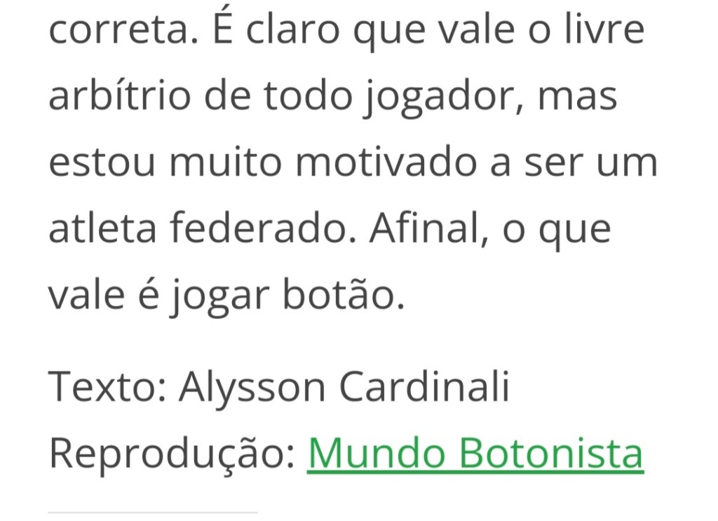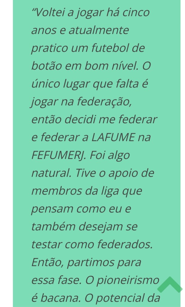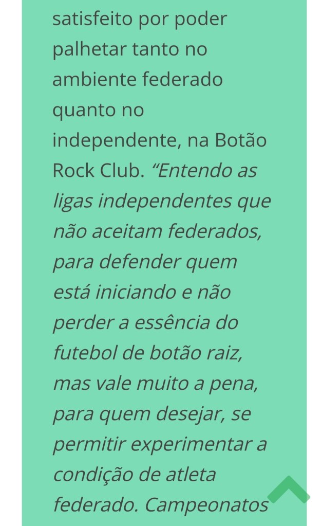 “Por essa razão, nesse mesmo livro ele abomina a ideia de colocar o seu nome na criação do futebol de botões. Seu trabalho foi, aos dezenove anos, publicar o primeiro livro de regras de futebol celotex. Chamou celotex porque as mesas onde jogavam eram feitas desse material, fabricado em Chicago (EUA) e que na atualidade se assemelham ao nosso Duratex (…)”
