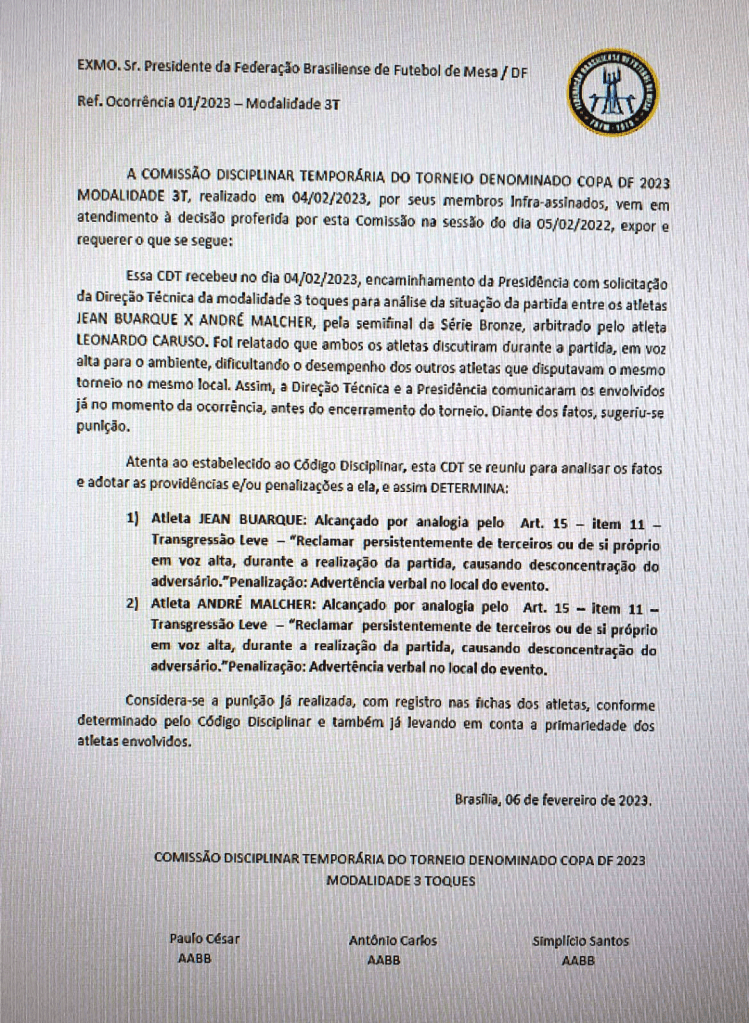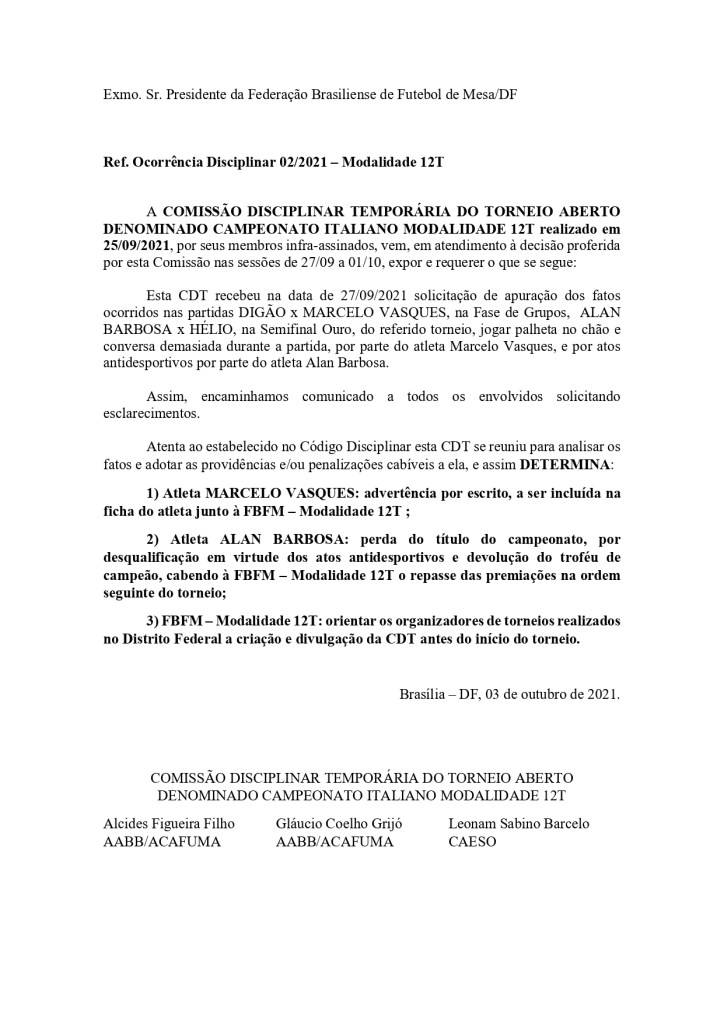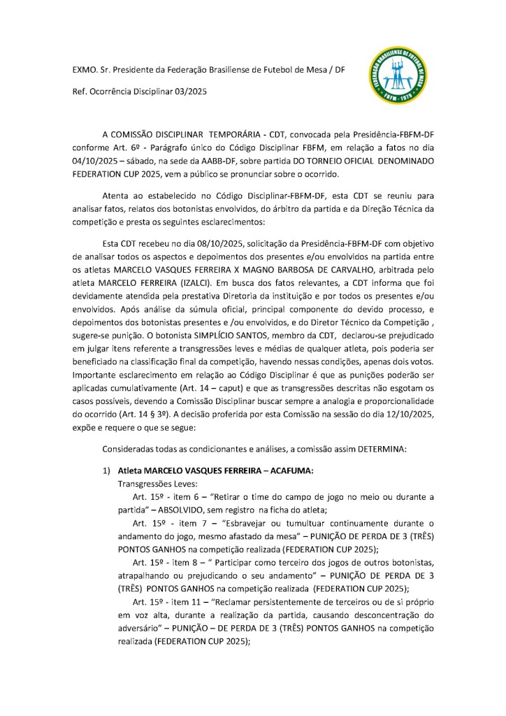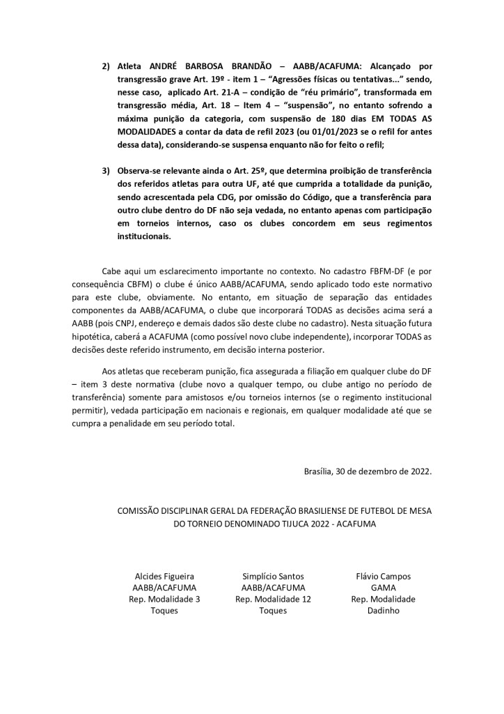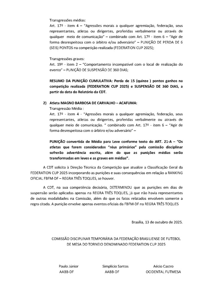 - Reconhecimento da prática de duas infrações médias (art. 17, V, do Código Disciplinar da FBFM);