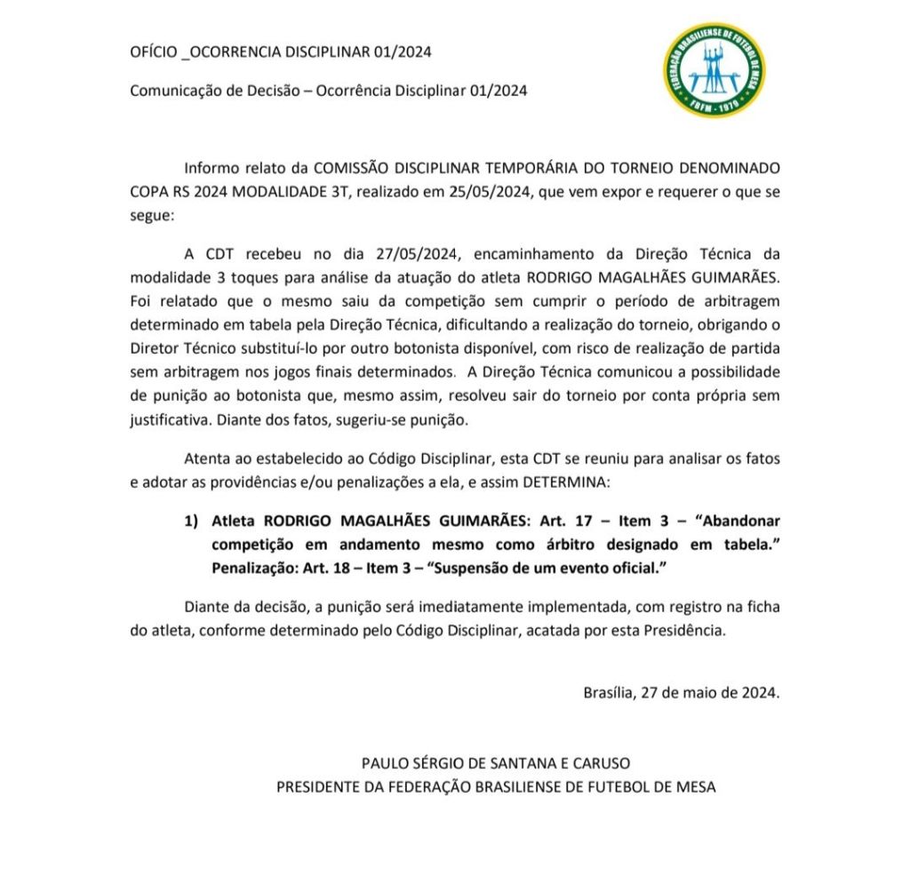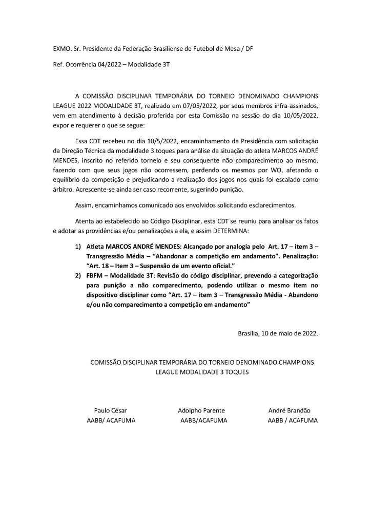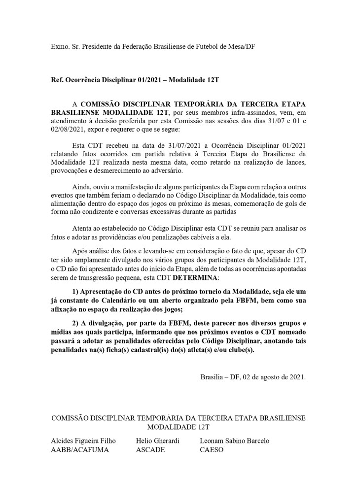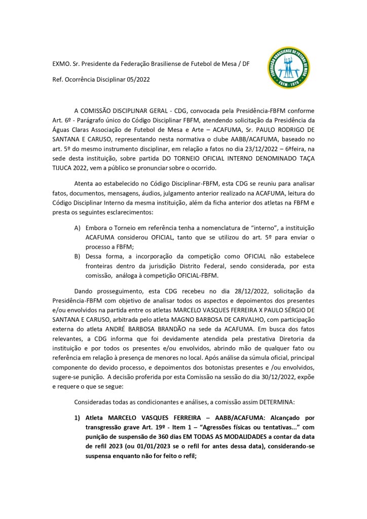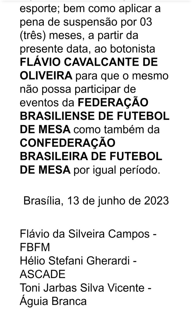 - Reconhecimento da prática de duas infrações médias (art. 17, V, do Código Disciplinar da FBFM);